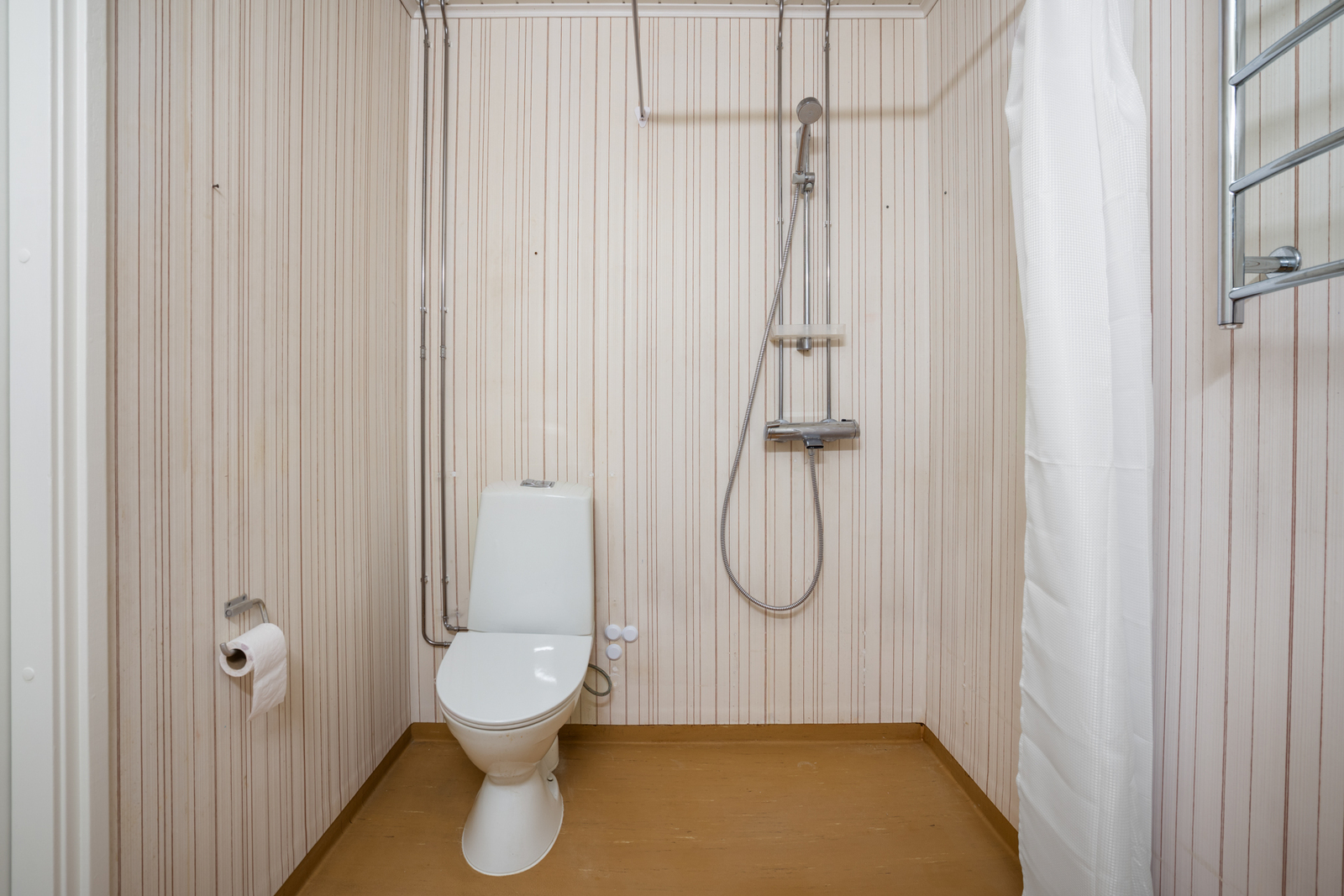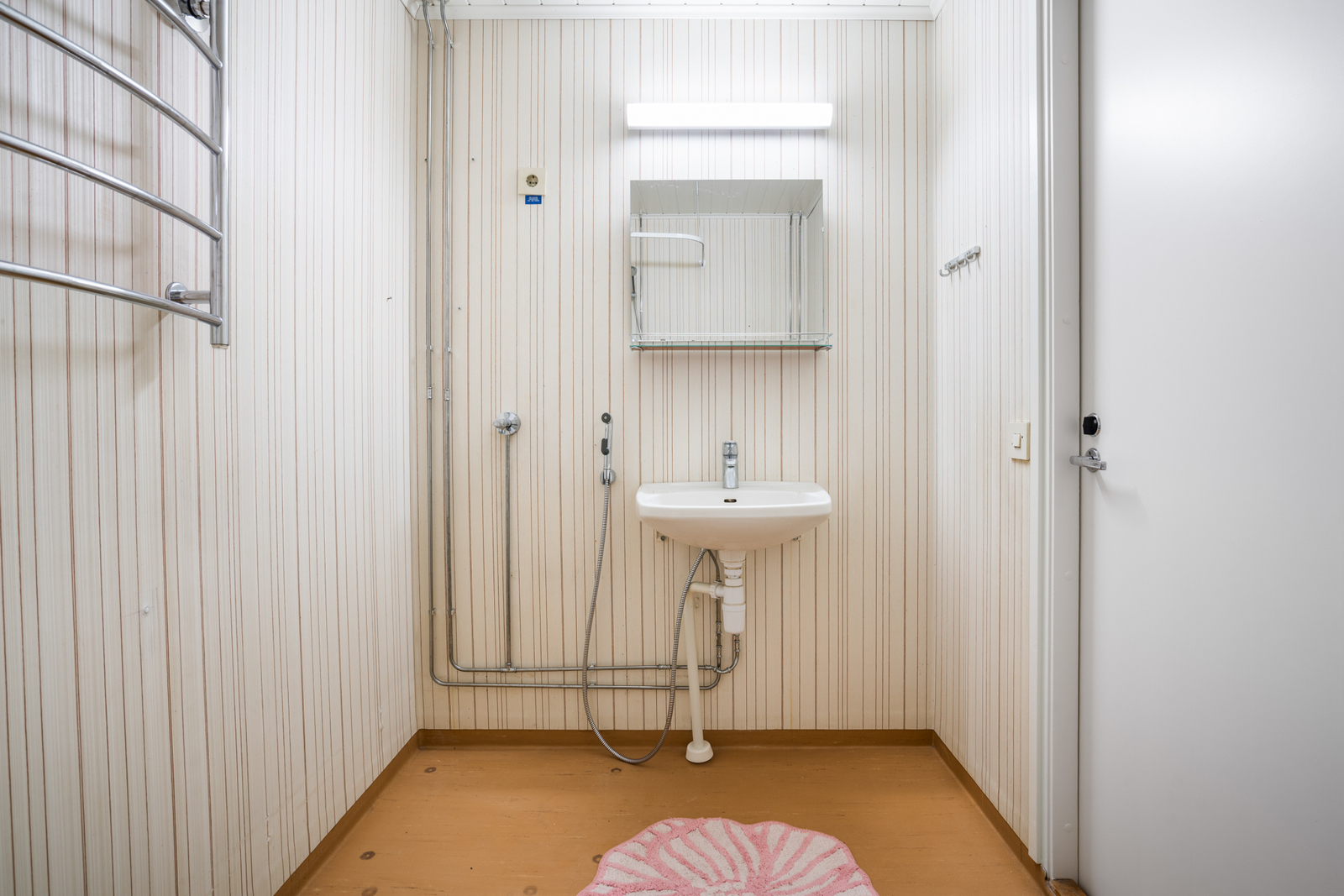 Pesukoneliitäntä, wc-istuin, peili ja suihku, seinät (muovimatto), lattiat (muovimatto) |