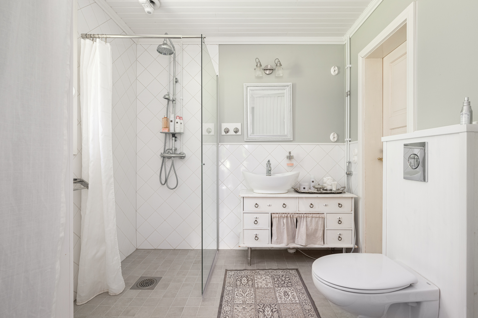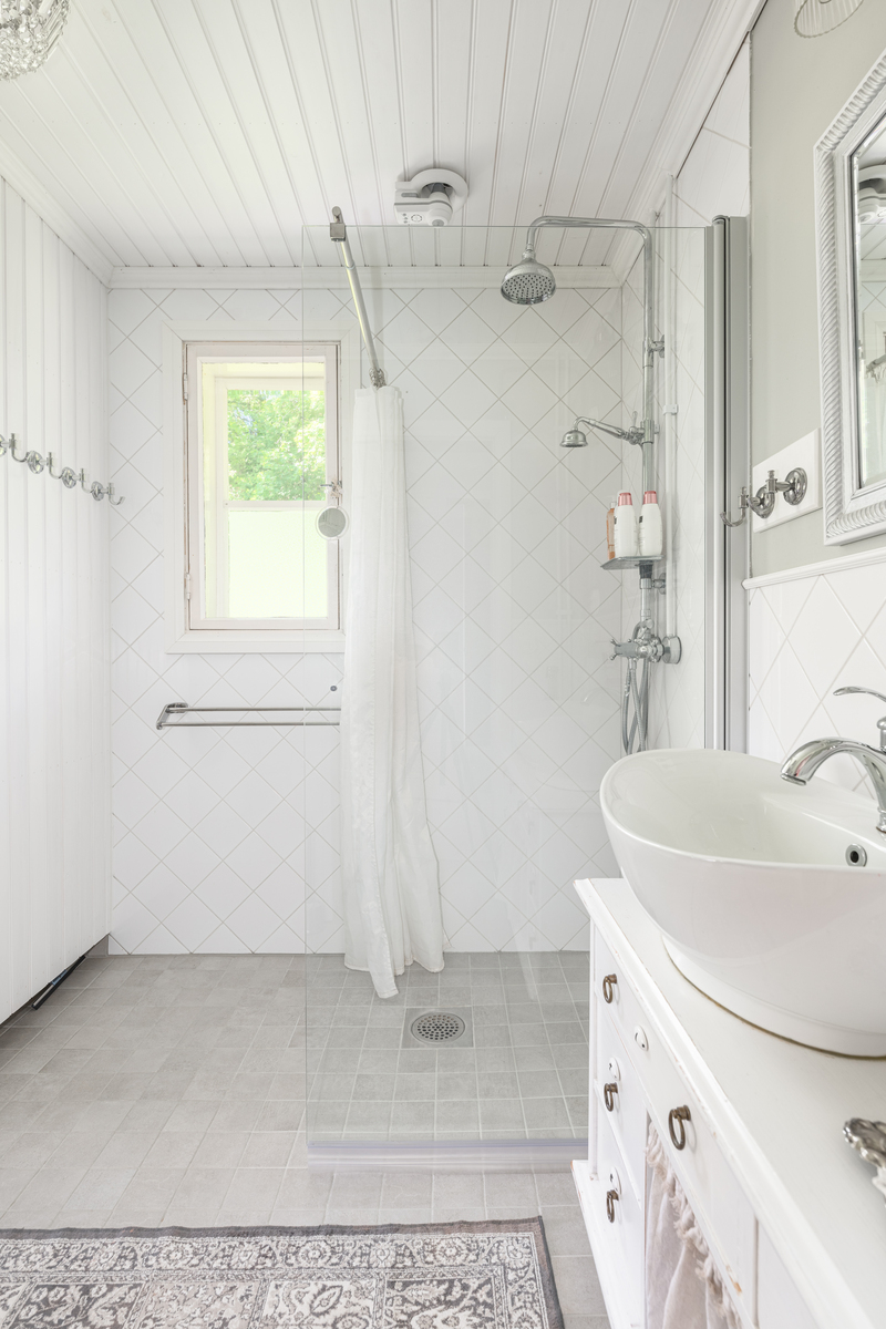 | Kylpyhuoneen kuvaus | Pesukoneliitäntä, suihkuseinä, wc-istuin, peili, lattialämmitys, suihku ja kiinteät valaisimet, seinät (kaakeli), lattiat (laatta) |