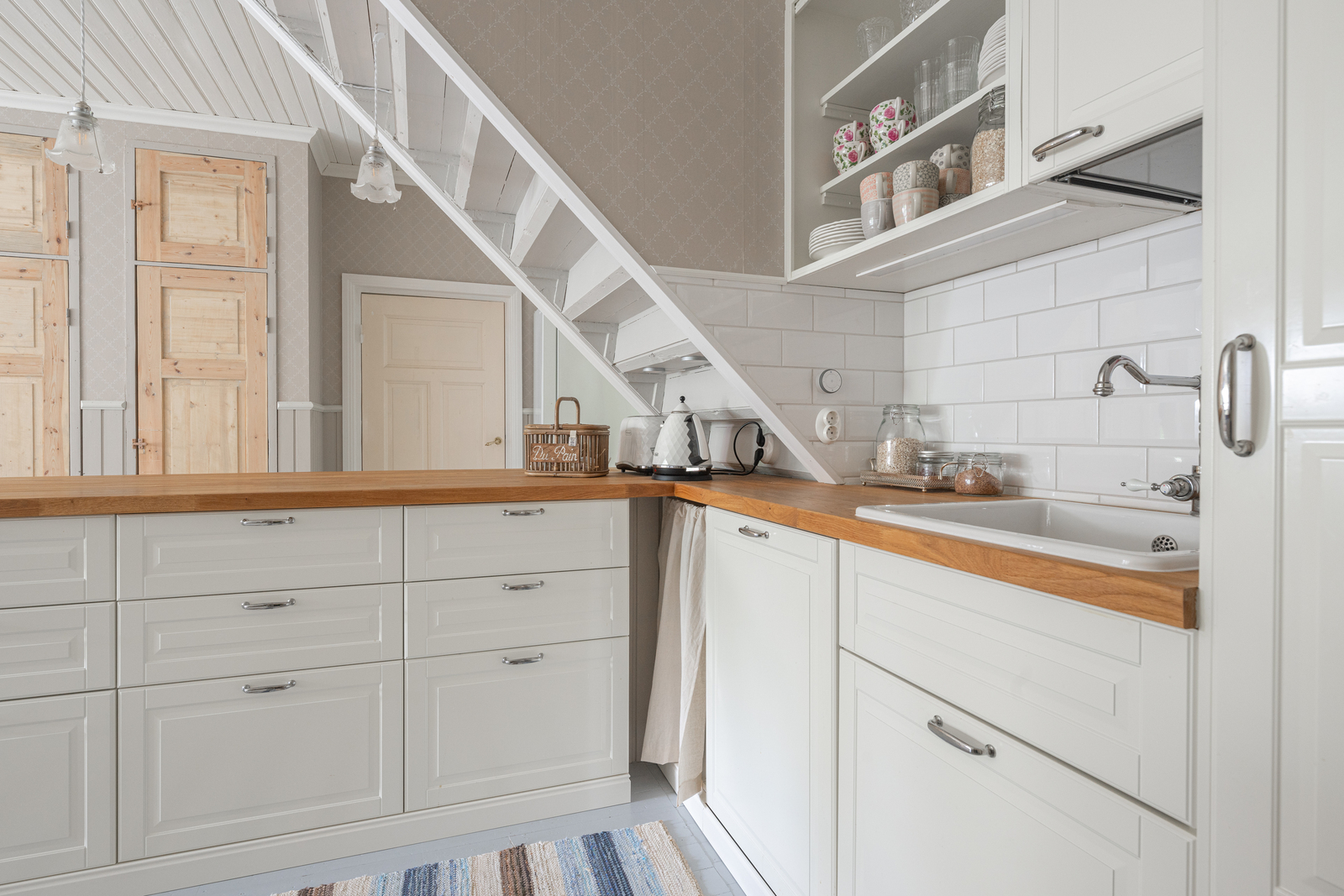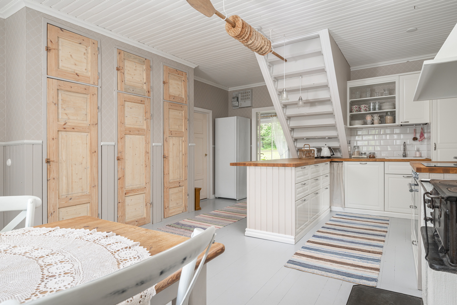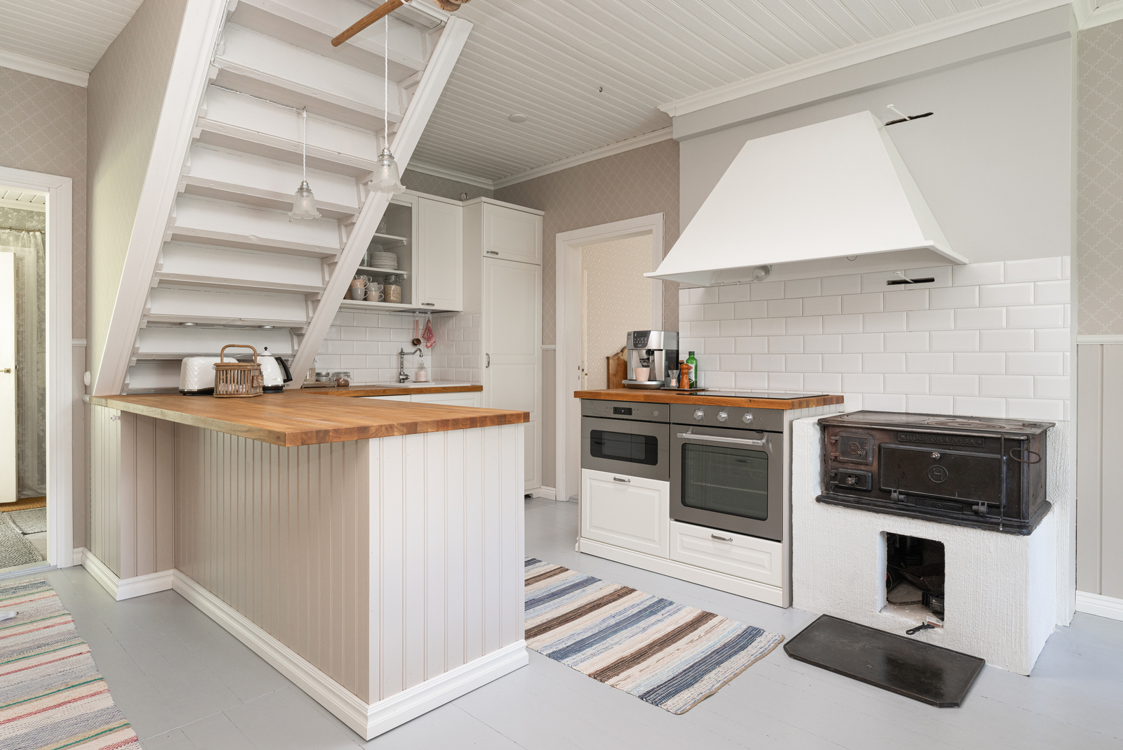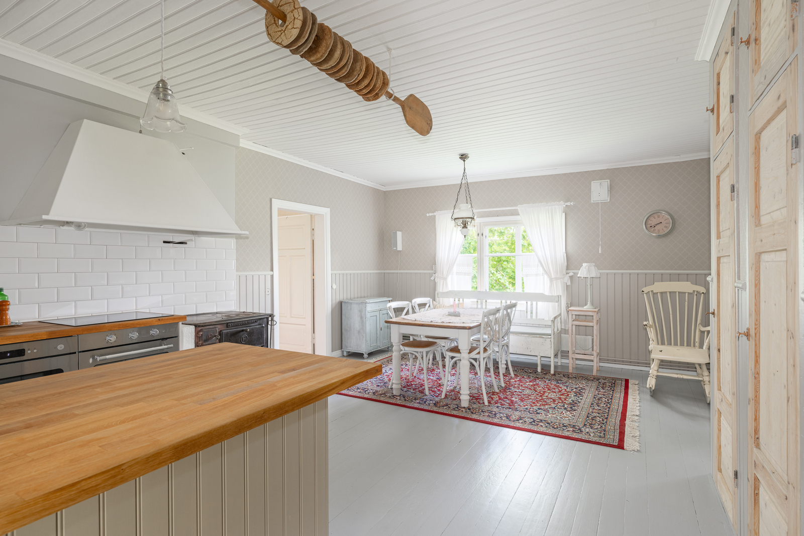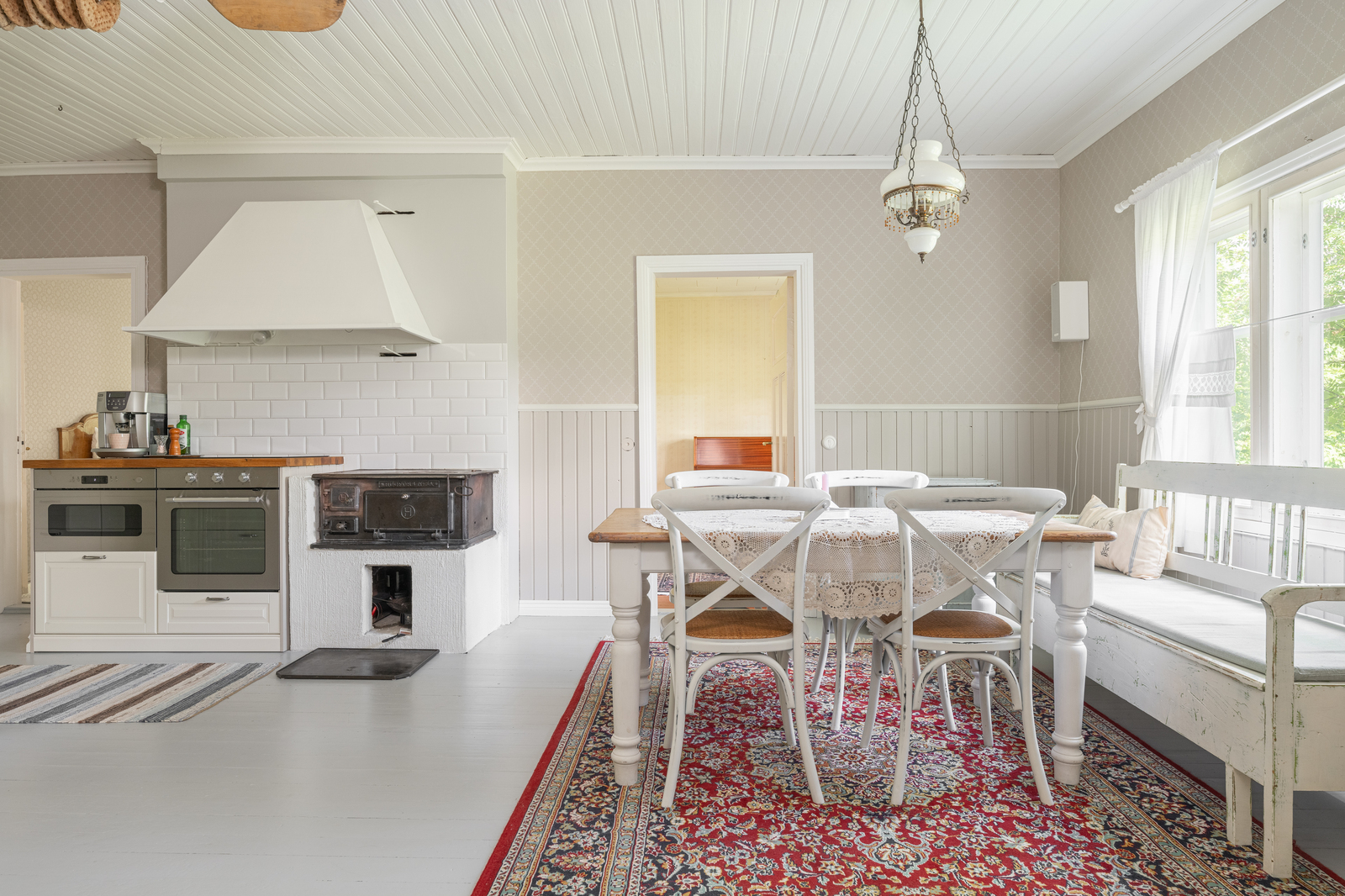 | Keittiön kuvaus | Liesi (Induktioliesi ja erillisuuni, puuliesi), seinät (tapetti ja puolipaneeli), lattiat (lauta), liesi, erillisuuni, astianpesukone, jääkaappipakastin, mikroaaltouuni ja liesituuletin / hormi |