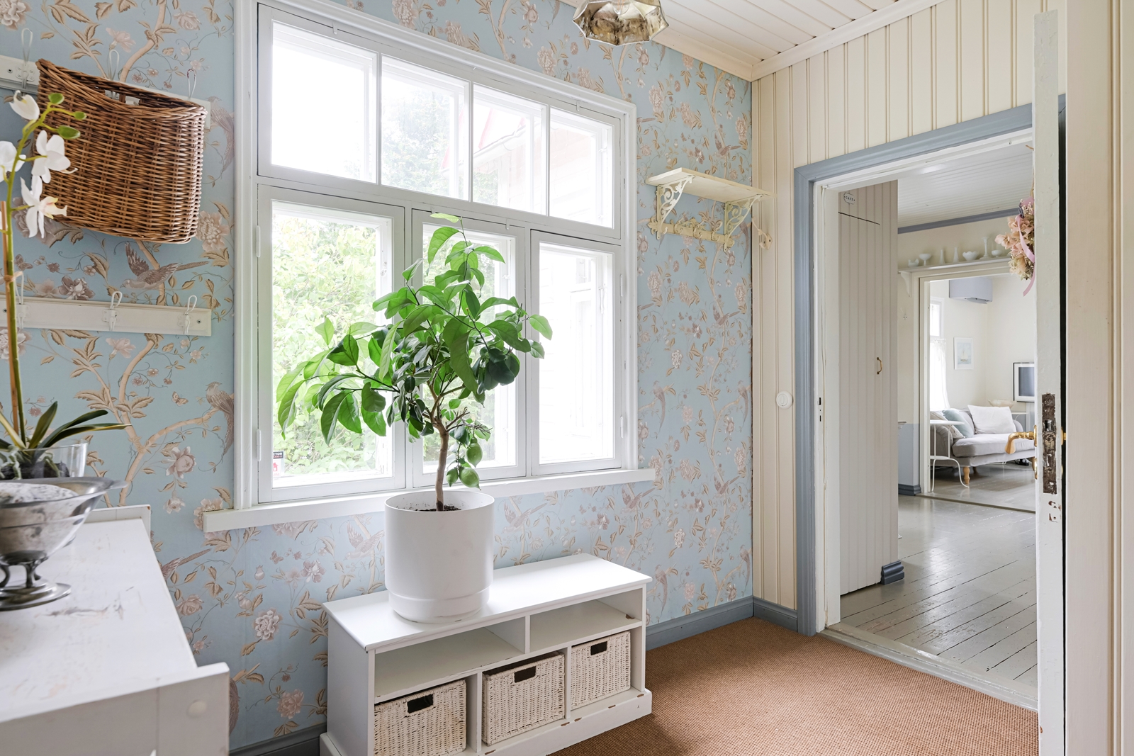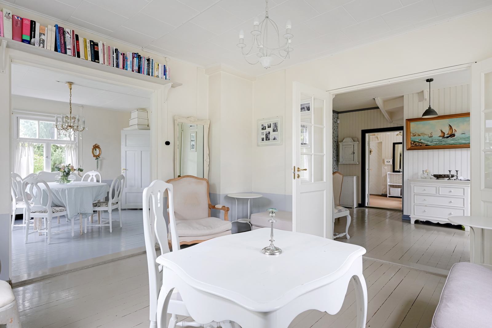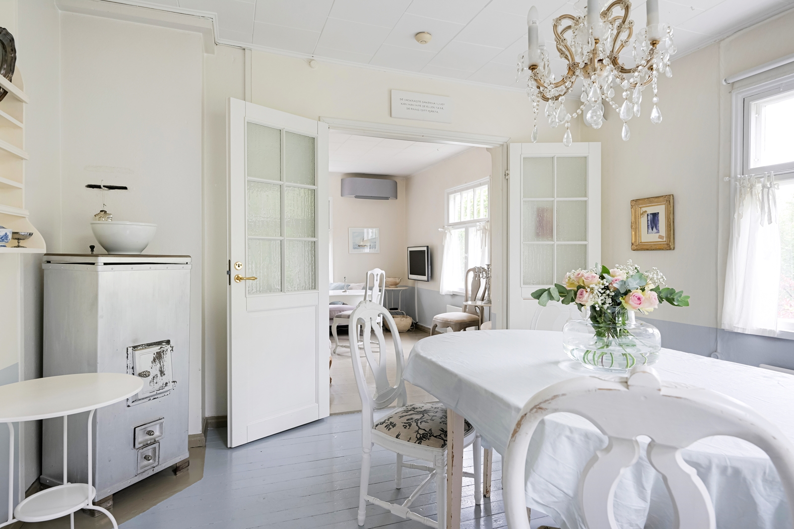 | Muut huoneet ja tilat | Talon ruokasalissa ja alakerran sisääntulohallissa on kauniit käytössä olevat peltiuunit. Valoisassa eteiskuistissa on tilaa vaatteille. Talon ihastuttavaa henkeä luovat hallitilat sekä ala- että yläkerrassa. |