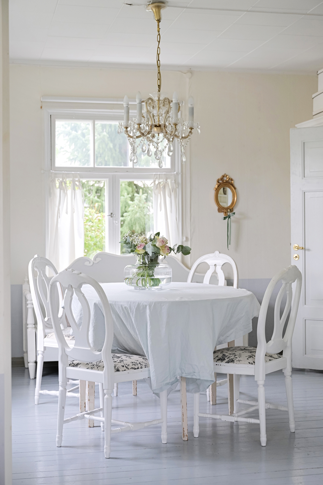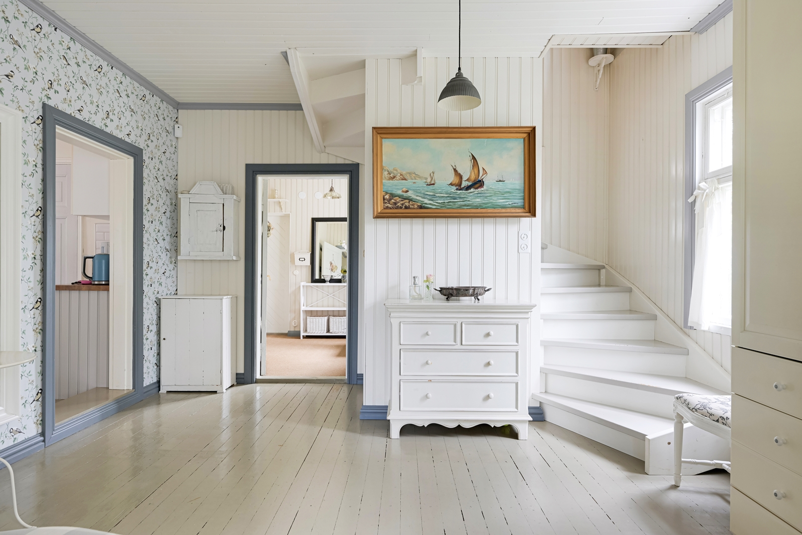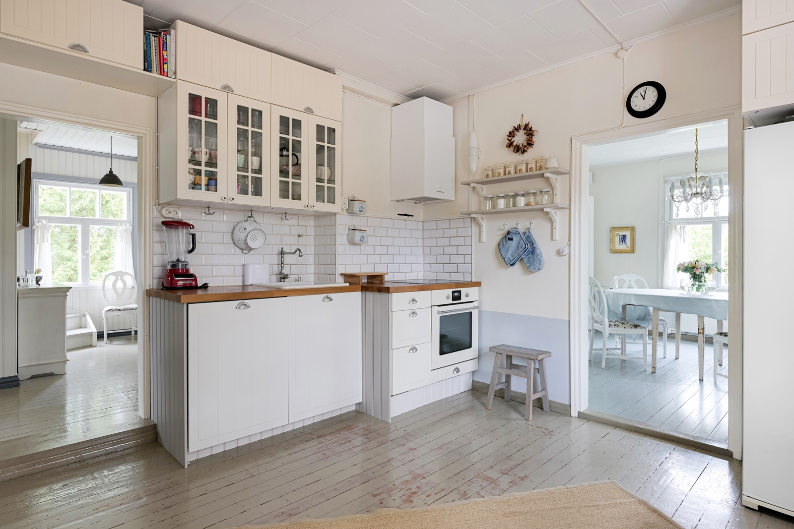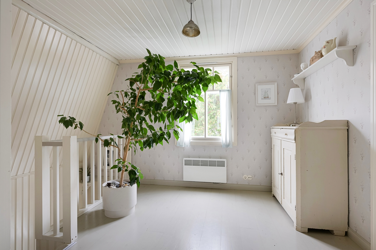 | Muut huoneet ja tilat | Talon ruokasalissa ja alakerran sisääntulohallissa on kauniit käytössä olevat peltiuunit. Valoisassa eteiskuistissa on tilaa vaatteille. Talon ihastuttavaa henkeä luovat hallitilat sekä ala- että yläkerrassa. |