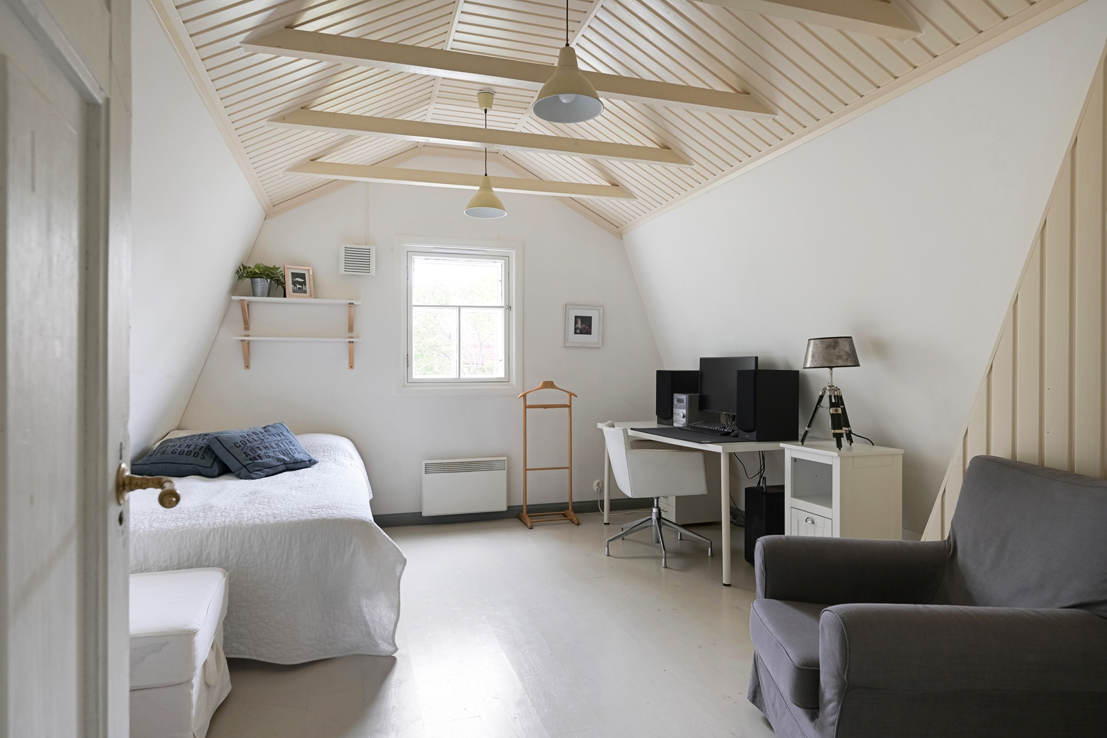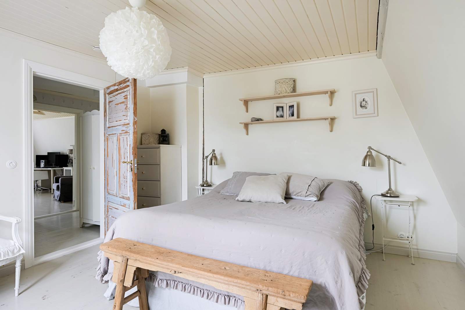 | Makuuhuoneen kuvaus | Kolme avaraa makuuhuonetta, joissa lankkulattiat ja perinteinen paneelikatto. |