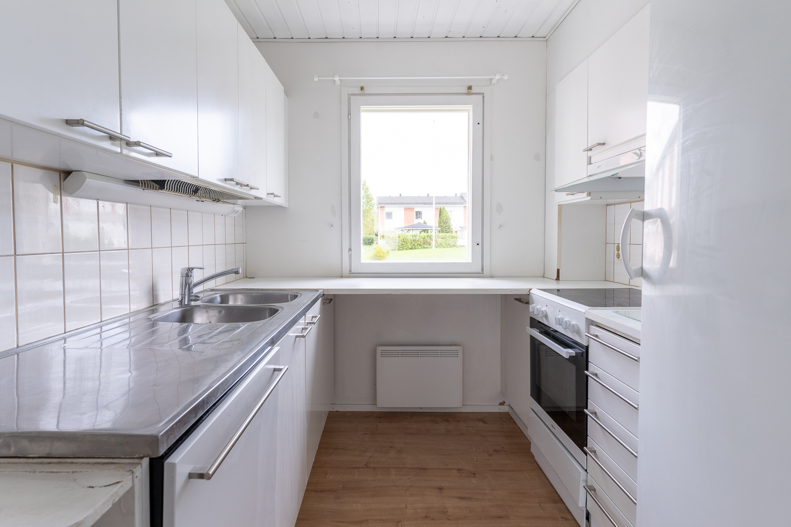 | Keittiön kuvaus | Liesi (Keraaminen liesi), työtasot (laminaatti ja metalli), seinät (laatta ja maali), lattiat (laminaatti), astianpesukone, jääkaappi, liesituuletin ja erillinen pakastin |