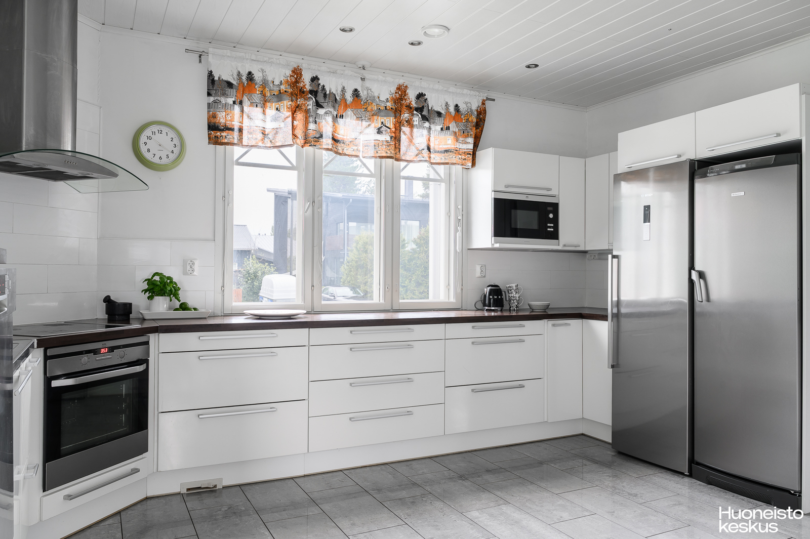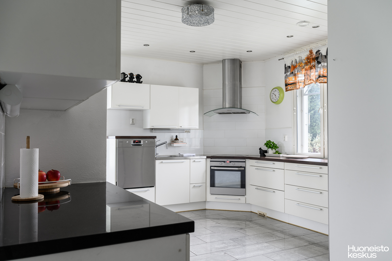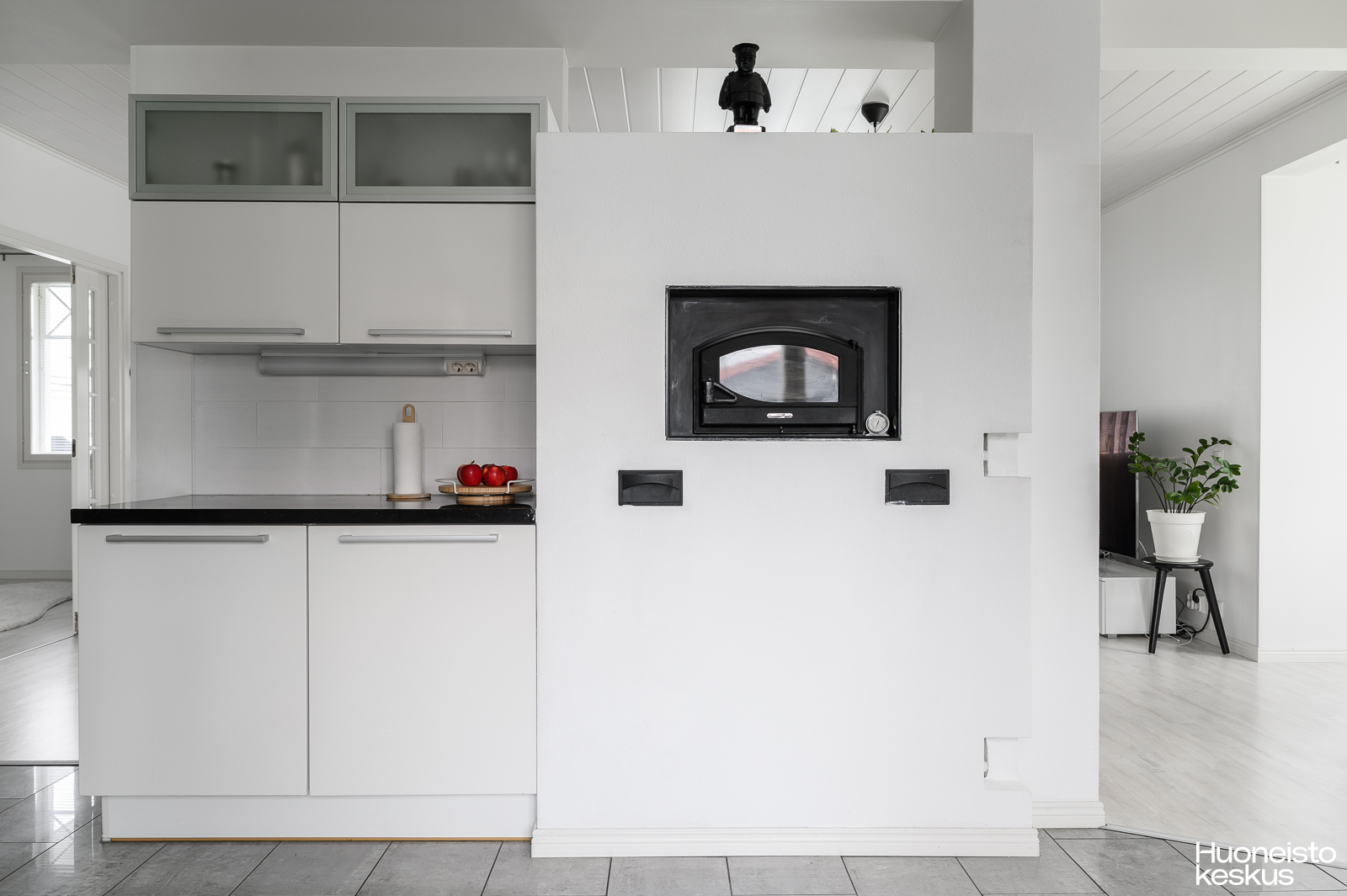Vaalea keittiö on suuri ja tarjoaa hienot puitteet ruoanvalmistukseen. Säilytystilaa on hyvin ja työskentelytilaa hienosti. Olitpa kotikokki tai leipuri, tästä nauttii varmasti arjessa. Keittiössä on myös upea leivinuuni, jossa haudutat maukkaimmat pataruoat ja valmistat herkullisimmat pitsat. Ruokailulle on kaunis ja valoisa tila erkkerissä.