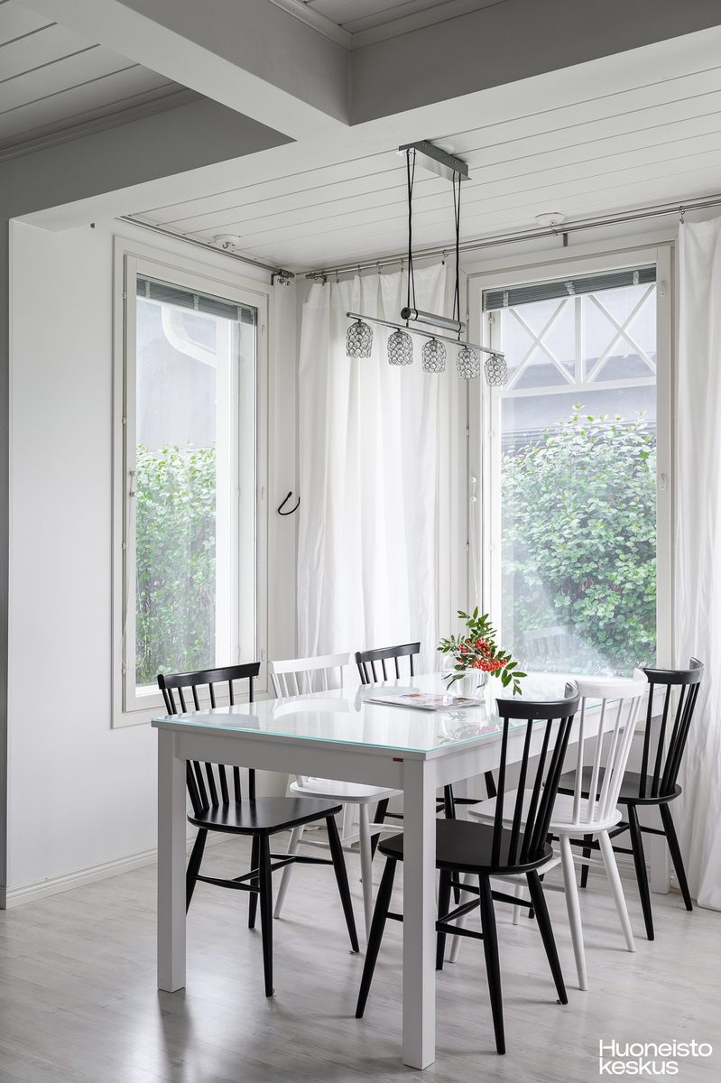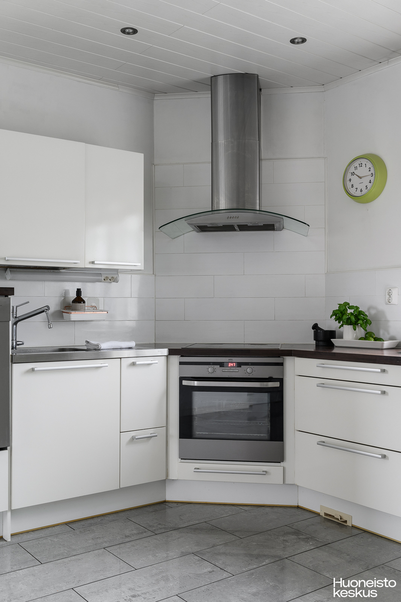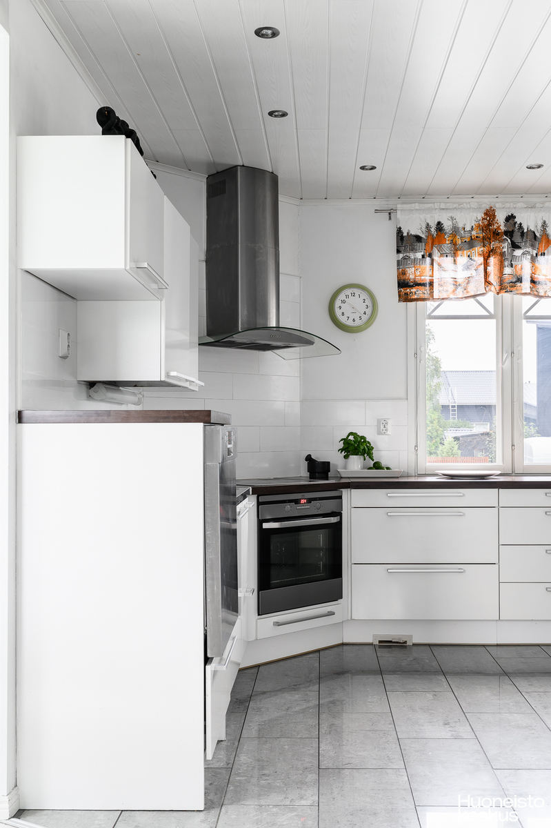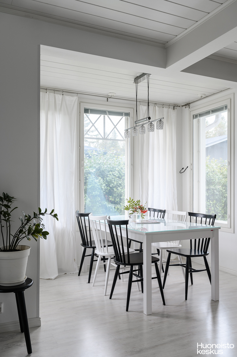 Vaalea keittiö on suuri ja tarjoaa hienot puitteet ruoanvalmistukseen. Säilytystilaa on hyvin ja työskentelytilaa hienosti. Olitpa kotikokki tai leipuri, tästä nauttii varmasti arjessa. Keittiössä on myös upea leivinuuni, jossa haudutat maukkaimmat pataruoat ja valmistat herkullisimmat pitsat. Ruokailulle on kaunis ja valoisa tila erkkerissä.