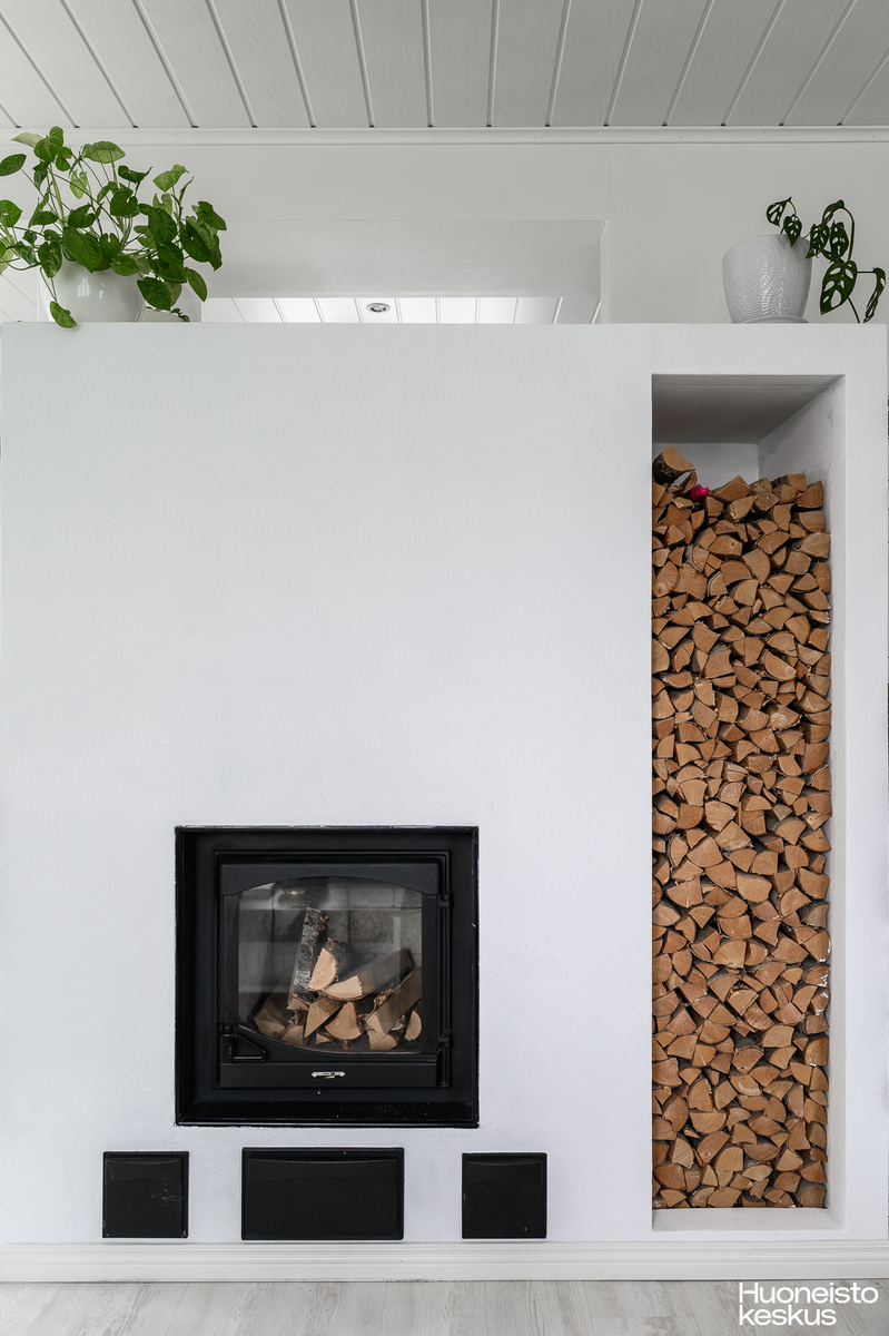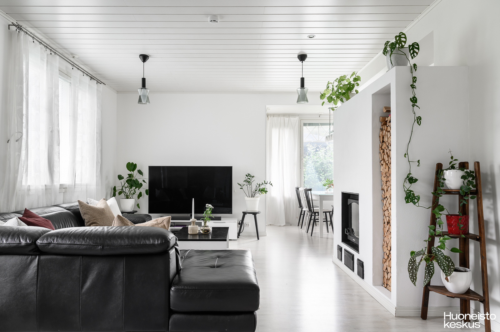 Olohuone on kutsuva ja helposti kalustettavissa. Se on oma rauhallinen tilansa, vaikkakin keittiön ja ruokailutilan läheisyydessä. Kaunis takka tuo lämpöä ja tunnelmallisuutta pimeneviin syysiltoihin.