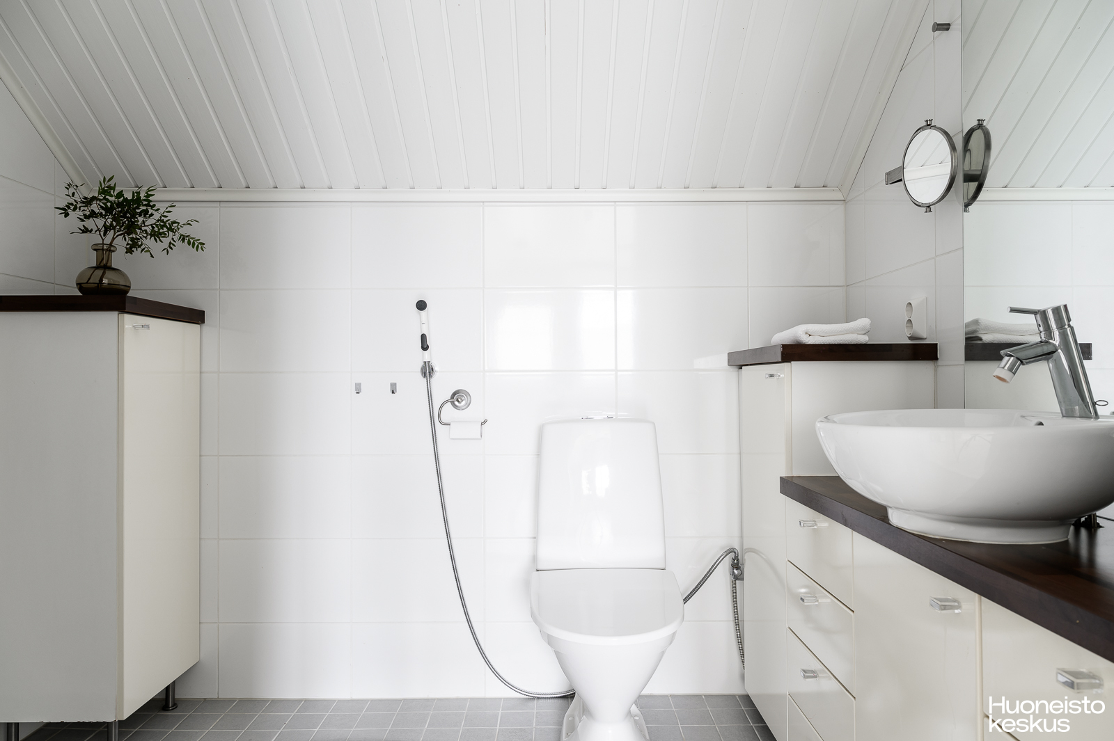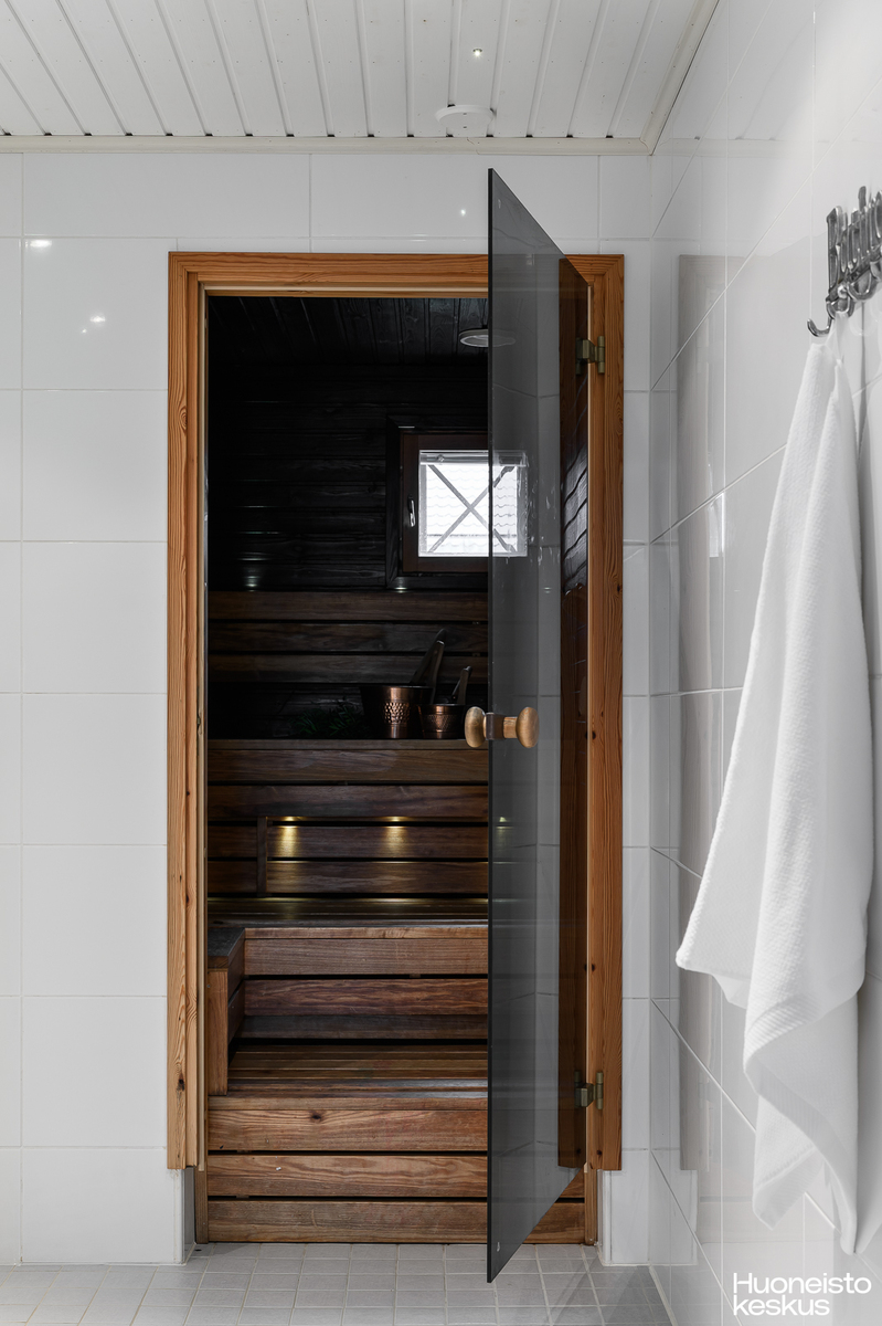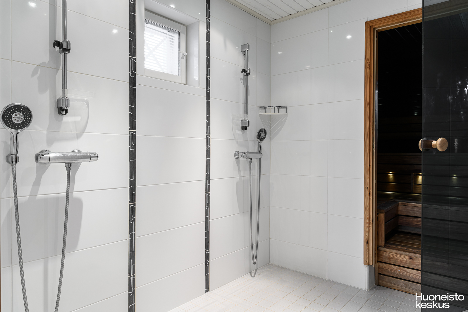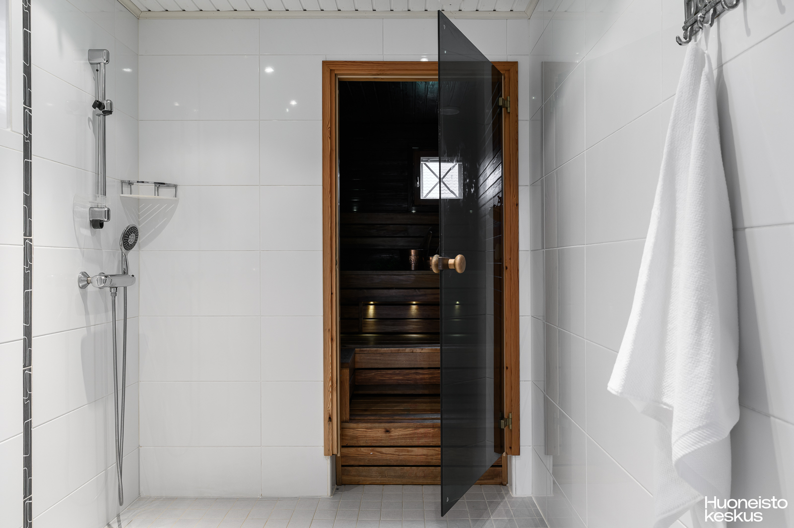 Kodinhoitotilat ovat tilavat ja käytännölliset. Kodinhoitohuoneessa on oma sisäänkäynti, jossa on kurapiste. Hieno lisä lapsi- ja koiraperheissä! Kodinhoitotilojen yhteydessä on myös vaatehuone, joka helpottaa kodin pyykkihuoltoa ja -säilytystä. Kylpytiloissa on kaksi suihkua ja ajaton värimaailma. Sauna on ihanan tunnelmallinen ja siellä on heti valmis -kiuas. Kodissa on wc-tilat alhaalla ja ylhäällä – ylhäällä on myös suihku.