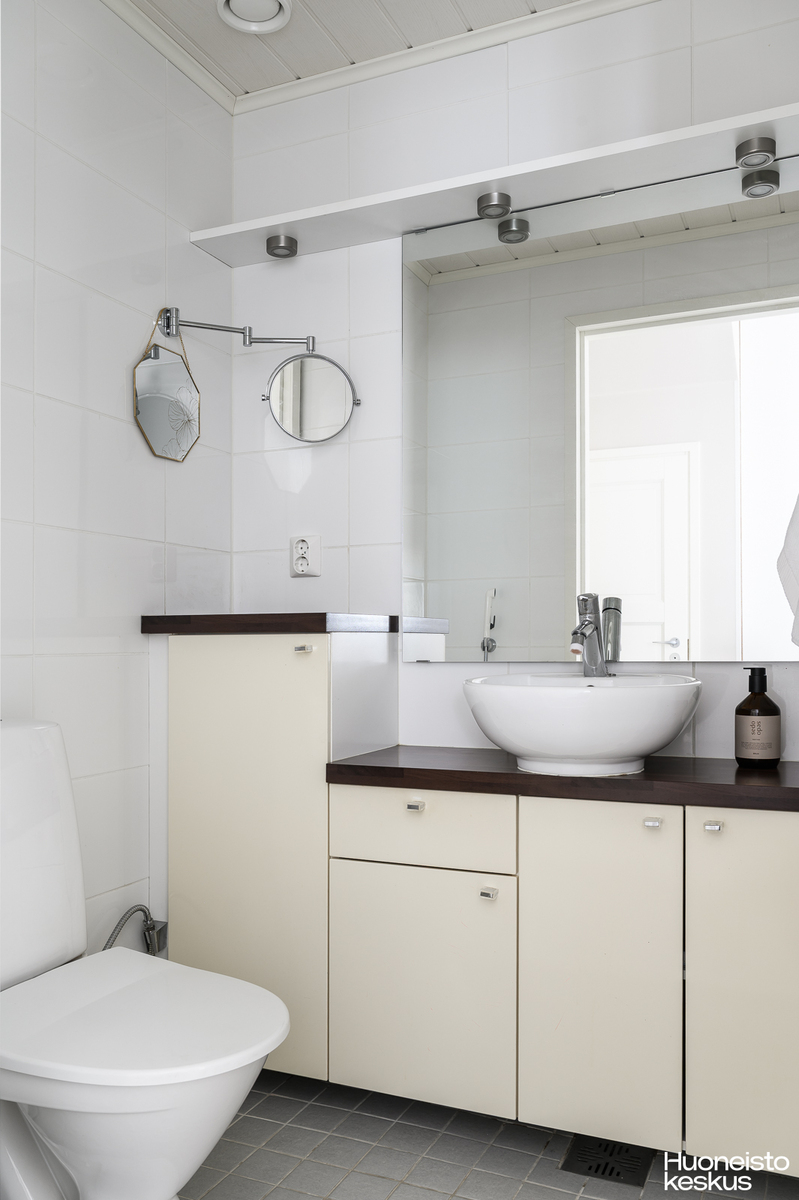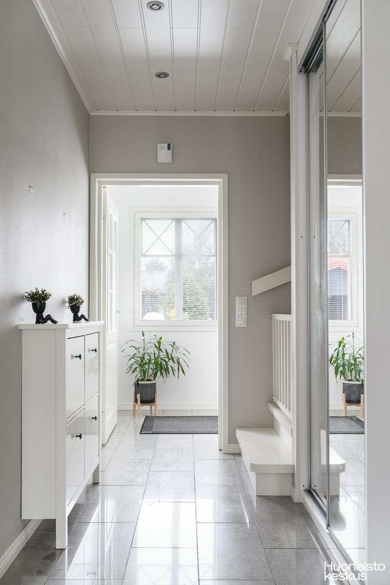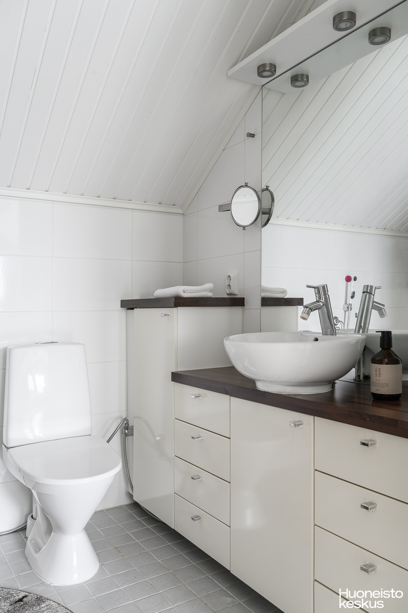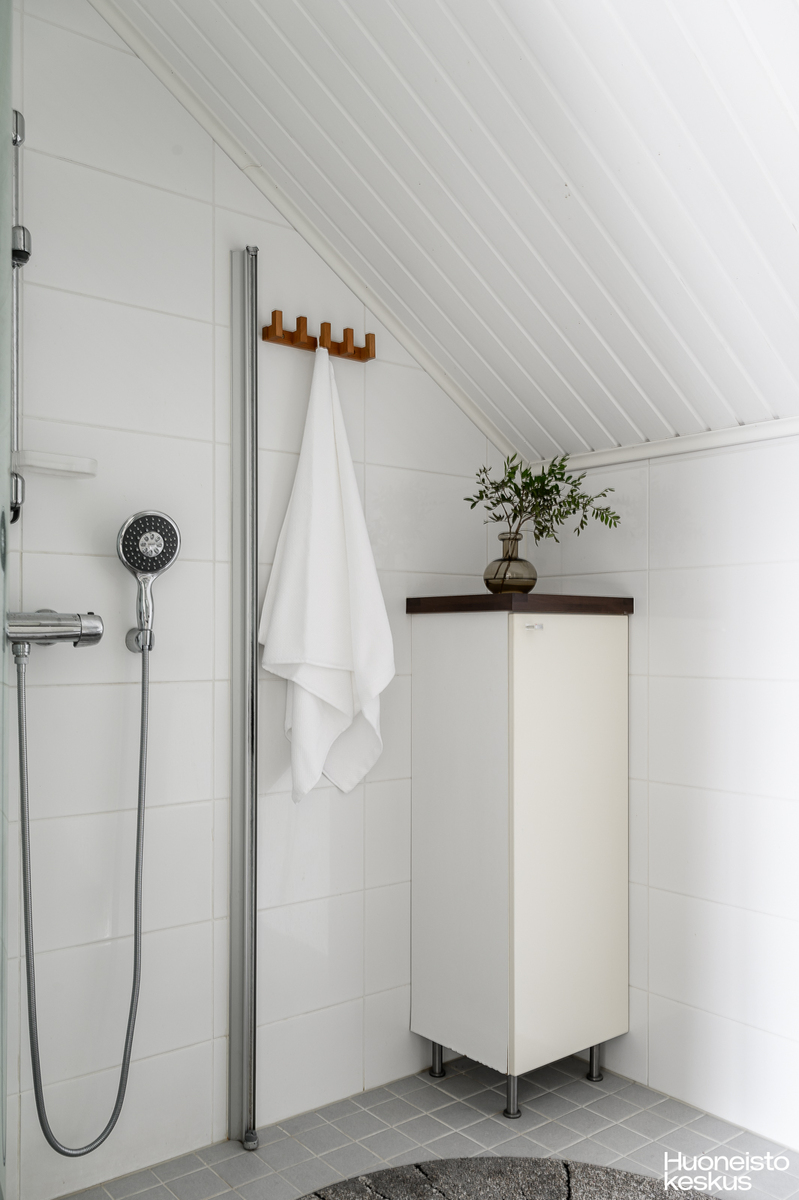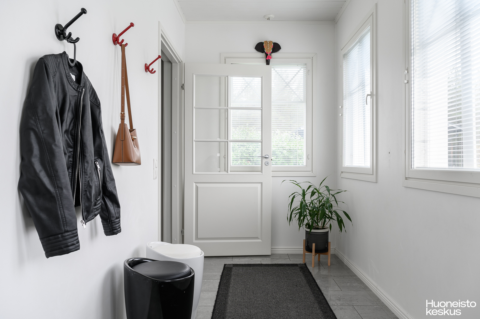 Kodinhoitotilat ovat tilavat ja käytännölliset. Kodinhoitohuoneessa on oma sisäänkäynti, jossa on kurapiste. Hieno lisä lapsi- ja koiraperheissä! Kodinhoitotilojen yhteydessä on myös vaatehuone, joka helpottaa kodin pyykkihuoltoa ja -säilytystä. Kylpytiloissa on kaksi suihkua ja ajaton värimaailma. Sauna on ihanan tunnelmallinen ja siellä on heti valmis -kiuas. Kodissa on wc-tilat alhaalla ja ylhäällä – ylhäällä on myös suihku.