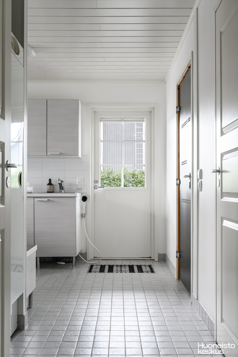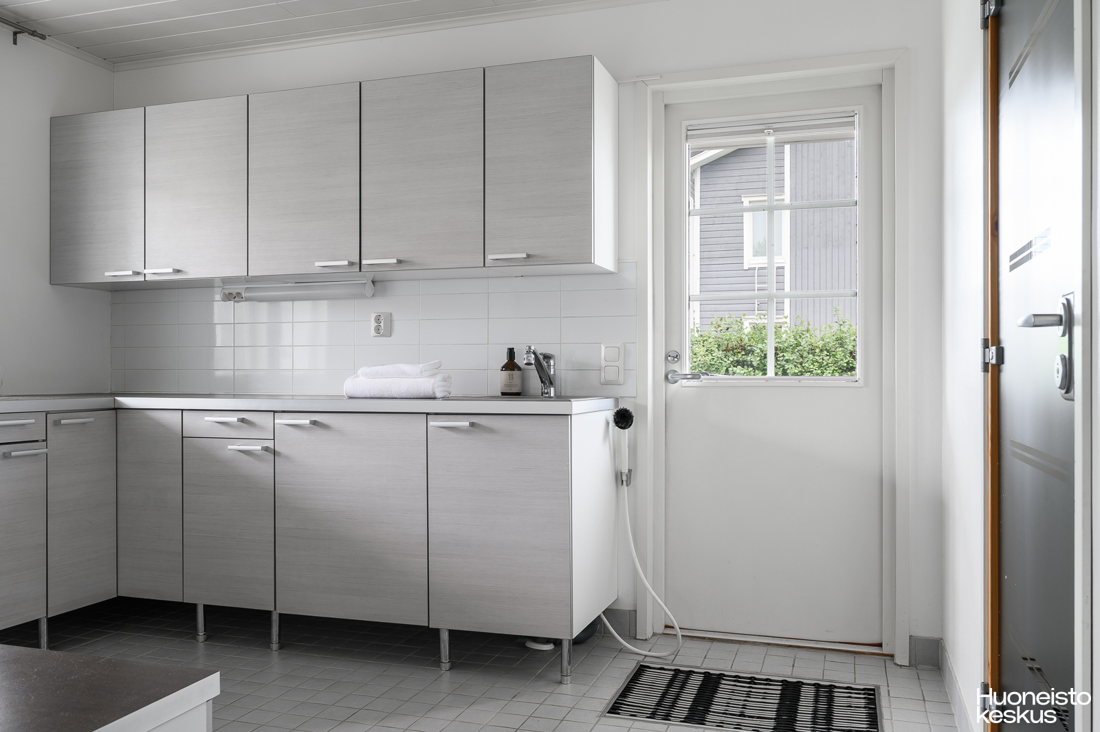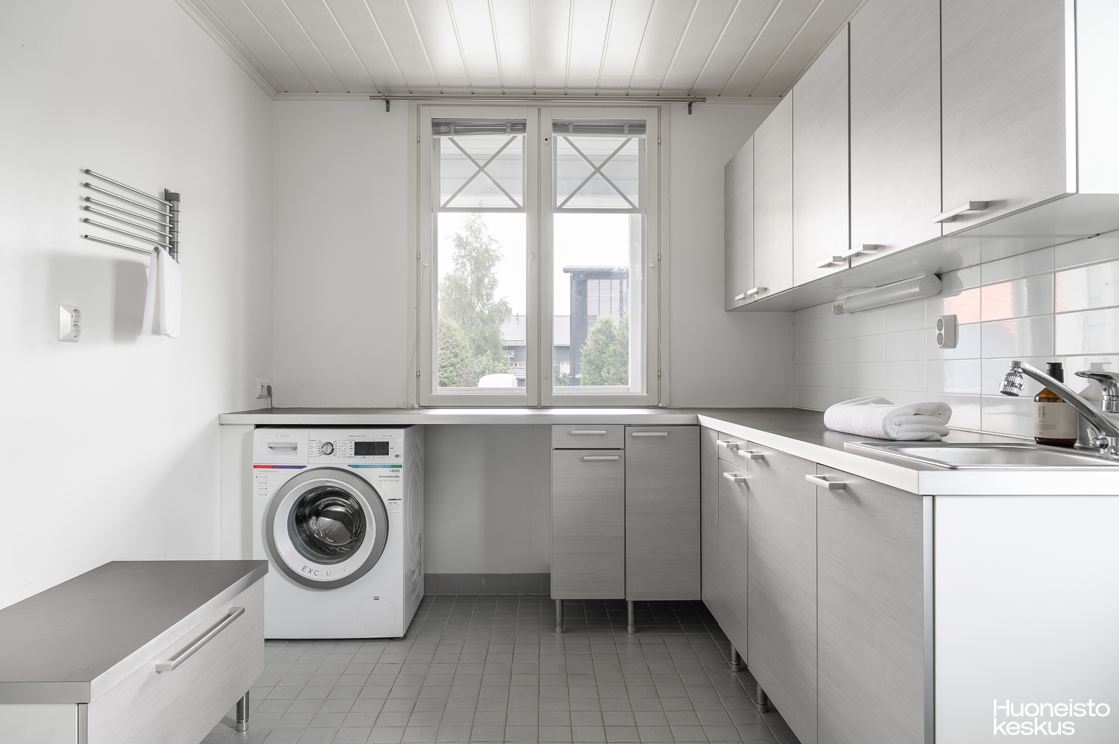 | Kodinhoitohuoneen kuvaus | Pesukoneliitäntä, pesuallas, pyykkikaapit, pöytätaso, lattialämmitys, silityspöytä/taso ja kurapiste, lattiat (laatta), seinät (maali) |