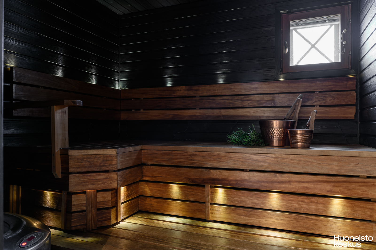 | Saunan kuvaus | Seinät (puu), lattiat (laatta), Sähkökiuas, Aina valmis -kiuas |
