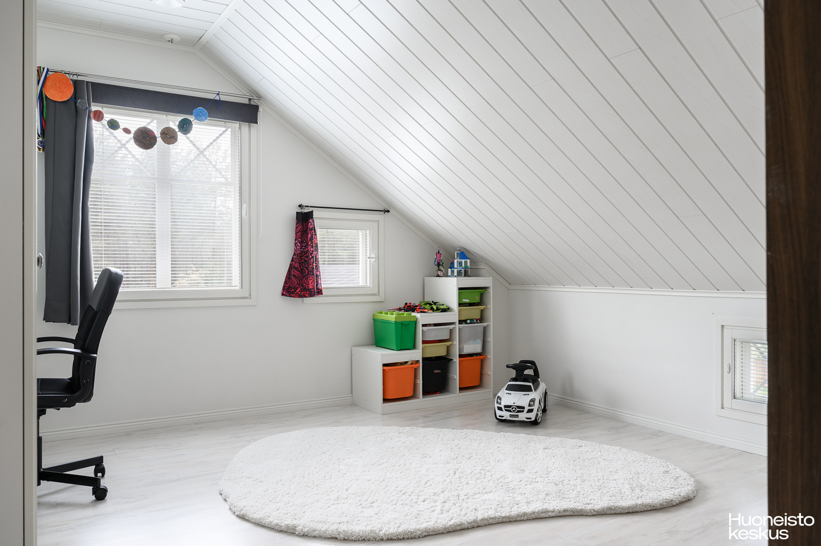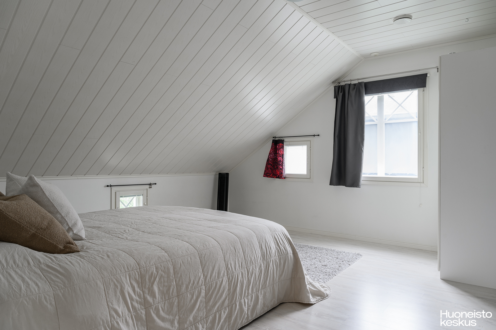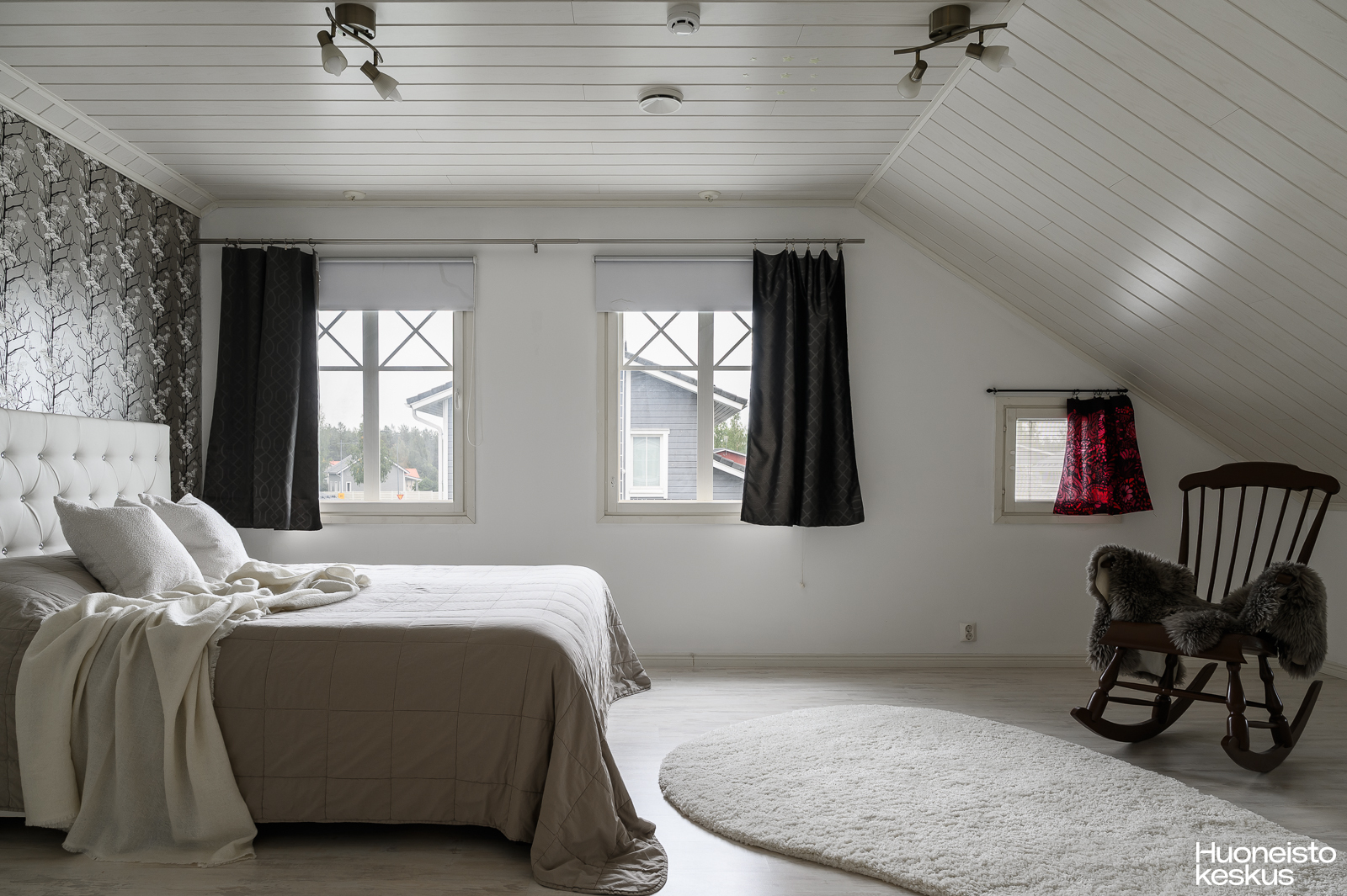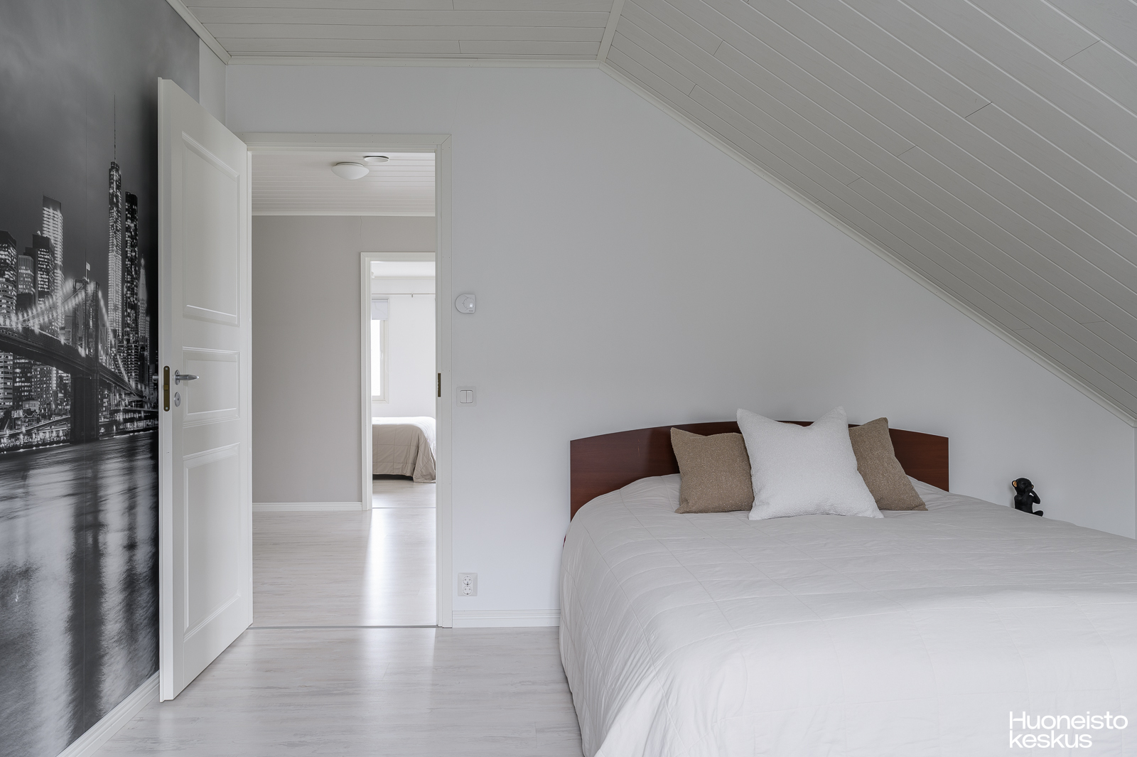 Makuuhuoneita kodissa on neljä, yksi alhaalla ja kolme ylhäällä. Alakerran makuuhuone sopii pariovine loistavasti myös kirjastoksi tai työ-/vierashuonekäyttöön. Päämakuuhuone on suuri ja sen yhteydessä on iso vaatehuone, joka toimii hienosti myös pukeutumishuoneena. Kodin toisessa päädyssä on kaksi makuuhuonetta, joissa on kaapistot Väliin jää aula, josta on käynti parvekkeelle. Tila on loistava esimerkiksi lasten omaksi olohuoneeksi.