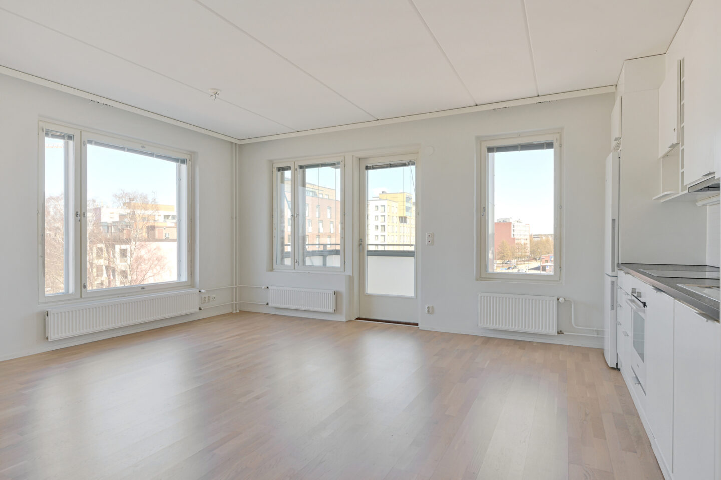 Yhdistetty keittiö ja olohuone, joka helpottaa sisustamista ja yhdessäoloa. Valoisan olohuoneen ikkunat pohjoiseen ja lasitetulle parvekkeelle itään. Olohuoneesta käynti suurelle lasitetulle parvekkeelle.