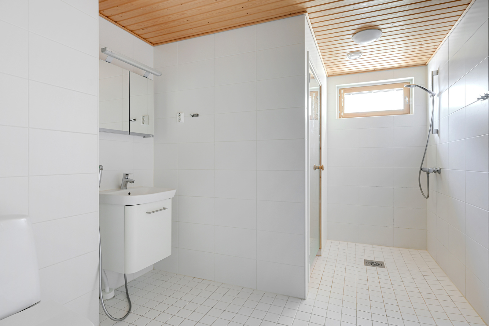Tilavassa kylpyhuoneessa on suihkutilalla oma ikkunallinen paikka. Myös saunassa on ikkuna länteen.