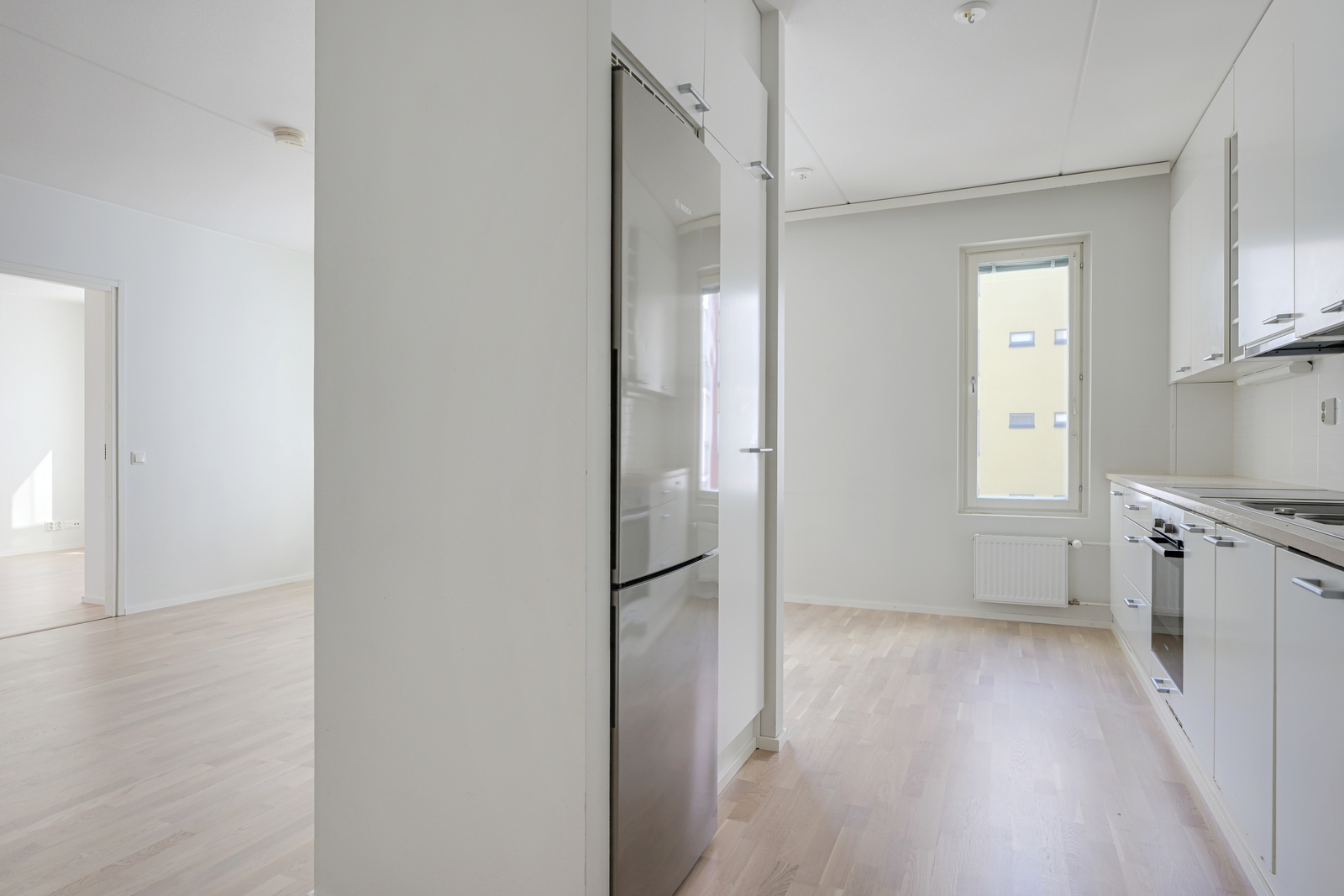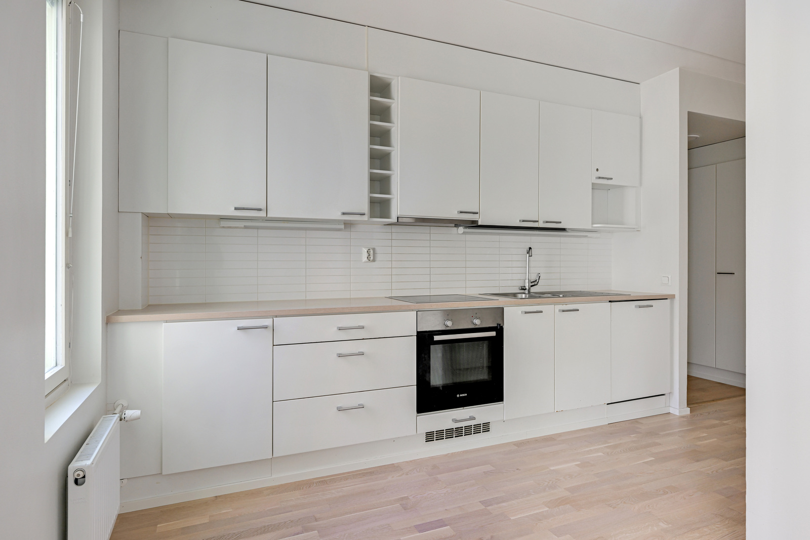 | Keittiön kuvaus | Lattiat (parketti), erillisuuni, liesituuletin, jääkaappipakastin, astianpesukone ja liesitaso |