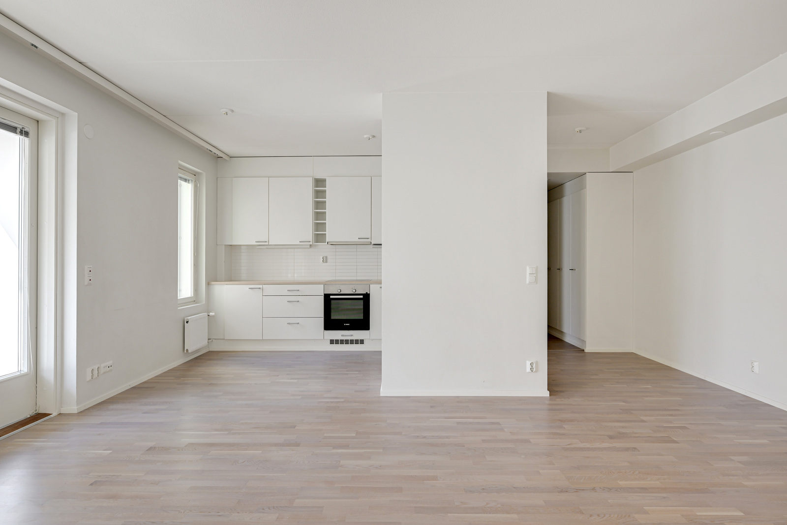 Yhdistetty keittiö ja olohuone, joka helpottaa sisustamista ja yhdessäoloa. Todella suuren yhtenäisen tilan rajaa keittiön kahden oven kaapisto, joka antaa yksityisyyttä ja sisustamiselle lisää mahdollisuuksia sekä ilmettä asunnolle.