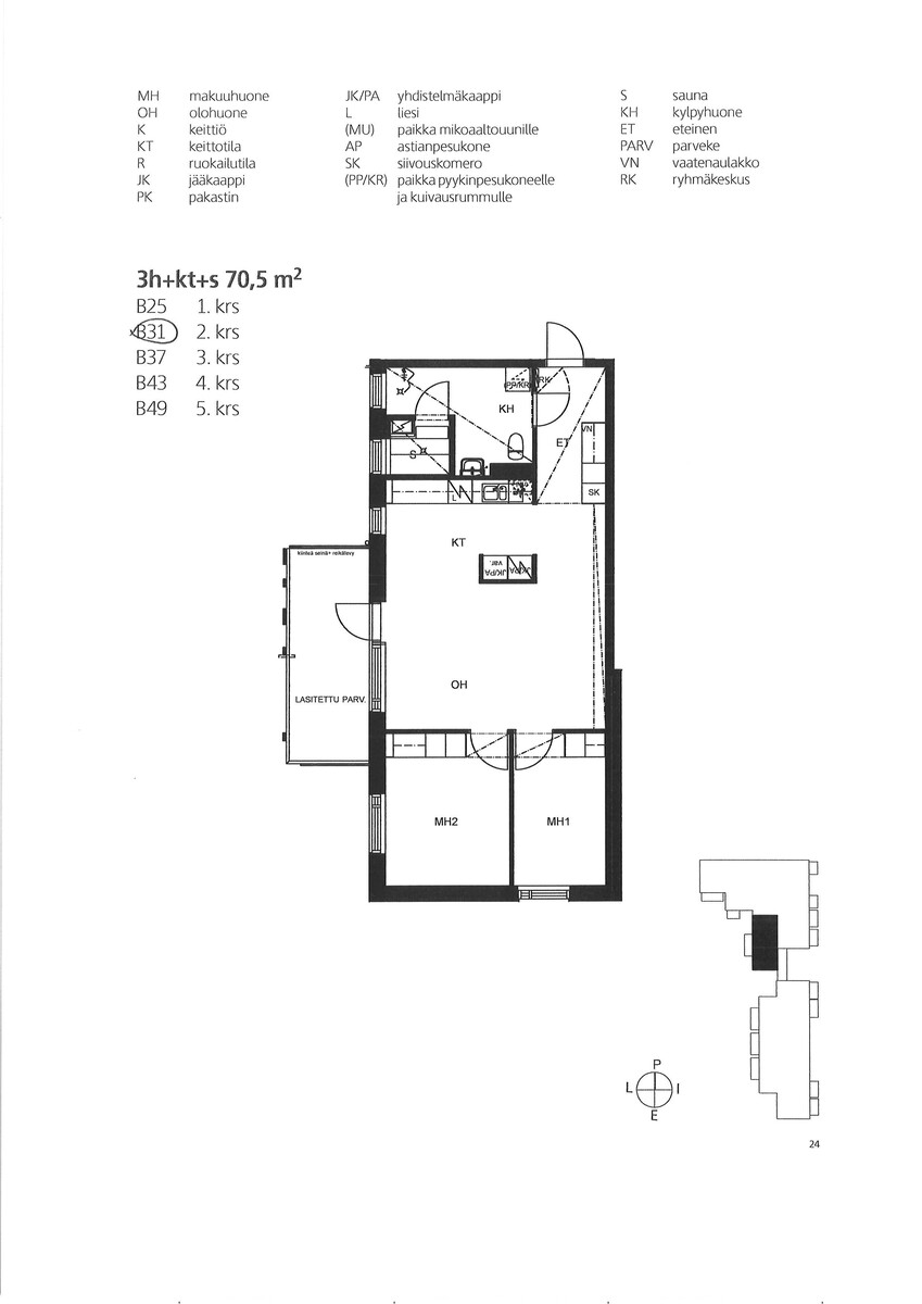 | Huoneistoselitelmä | 3h+kt+s+kph+lasitettu parveke |