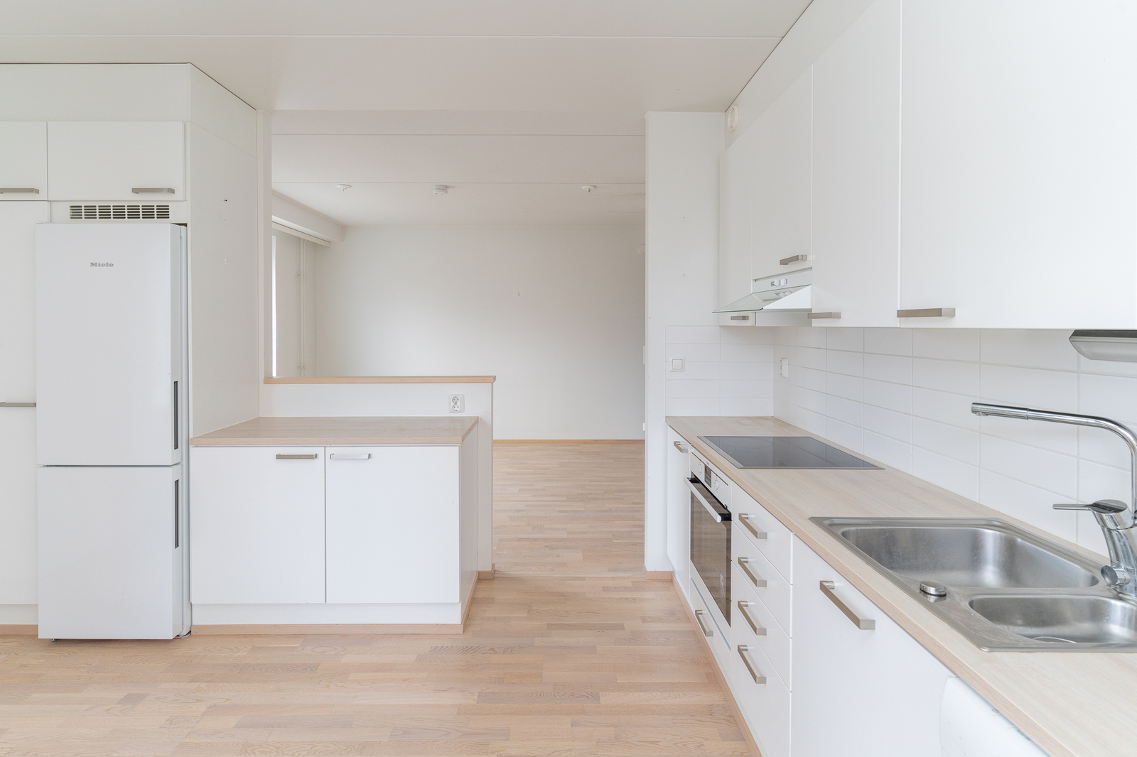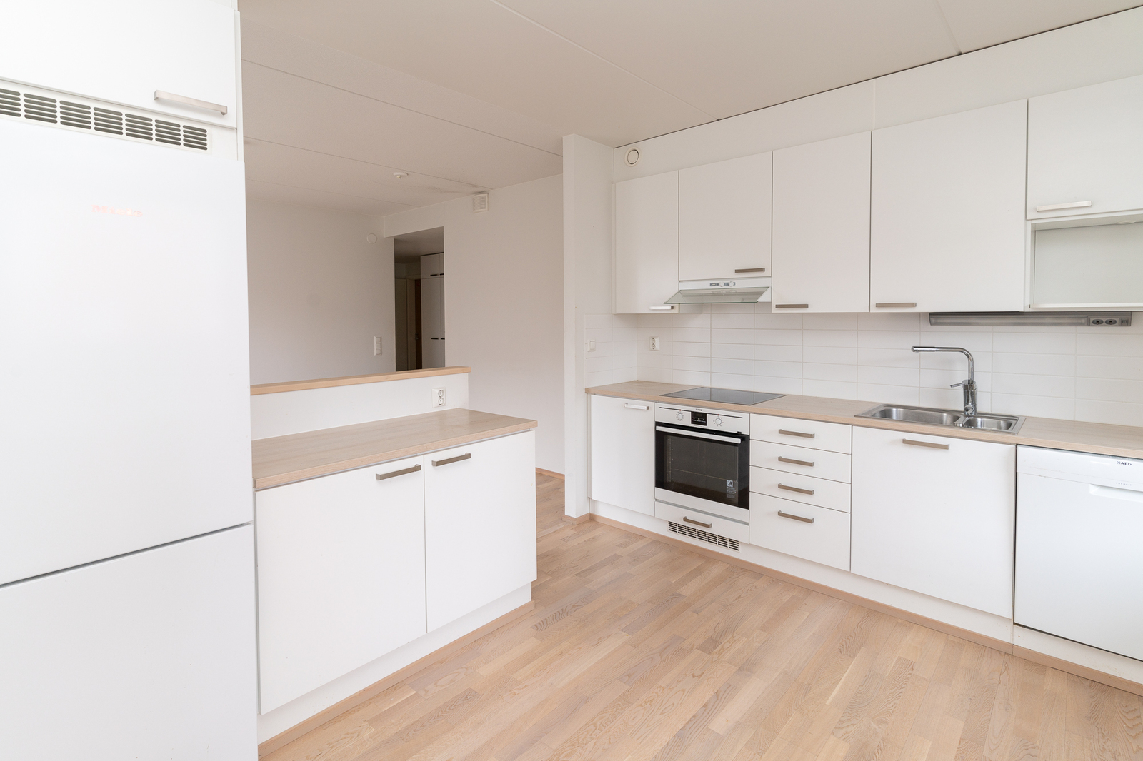 Liesi (Keraaminen liesi), työtasot (laminaatti), seinät (maali), lattiat (parketti), astianpesukone, jääkaappipakastin, liesituuletin ja kiinteät valaisimet |