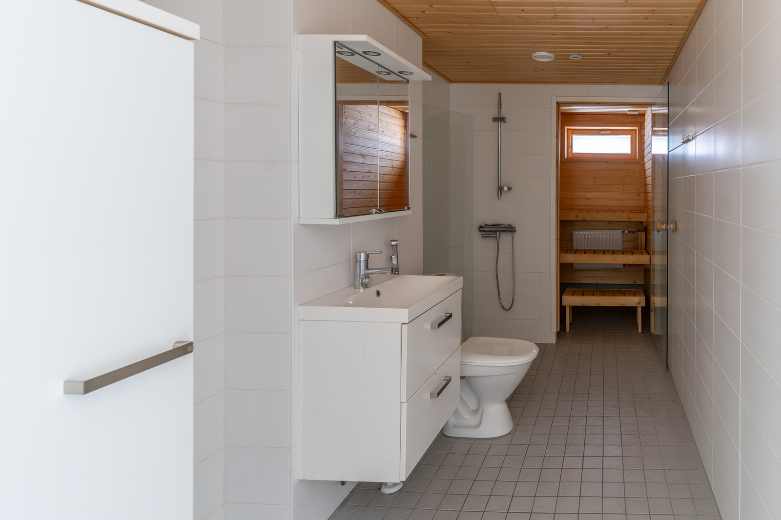 Pesukoneliitäntä, lattialämmitys, peilikaappi, wc-istuin, suihku ja kiinteät valaisimet, seinät (kaakeli), lattiat (laatta) |