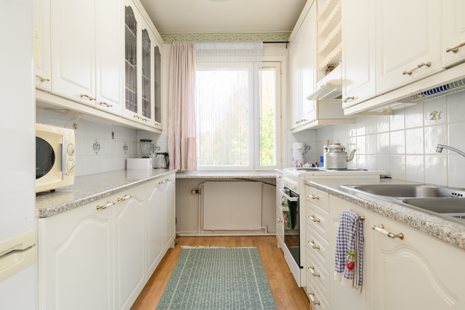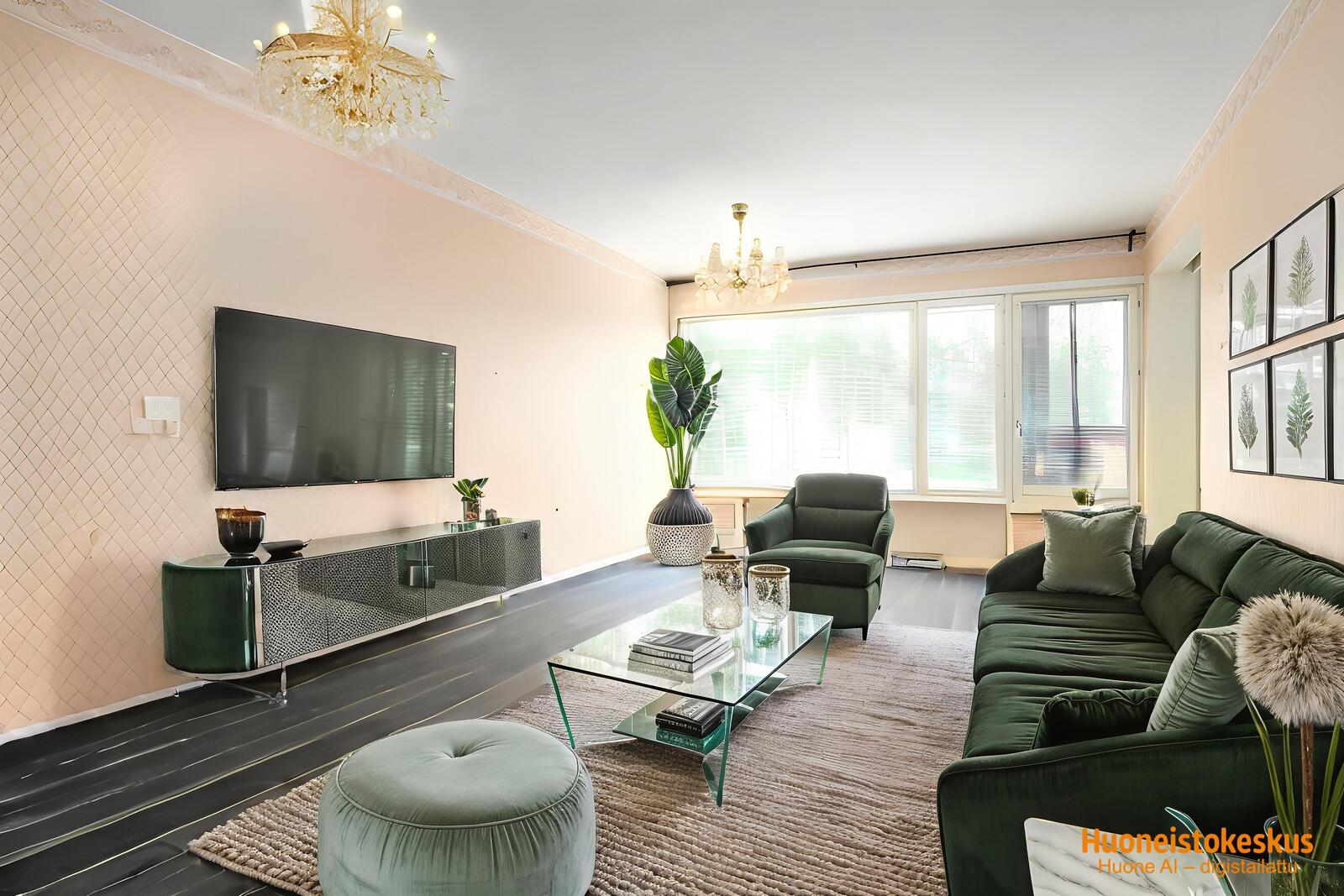 | Keittiön kuvaus | Liesi (sähköliesi), seinät (maali ja osalaatoitus), lattiat (parketti), jääkaappipakastin, liesituuletin, liesi ja kiinteät valaisimet |