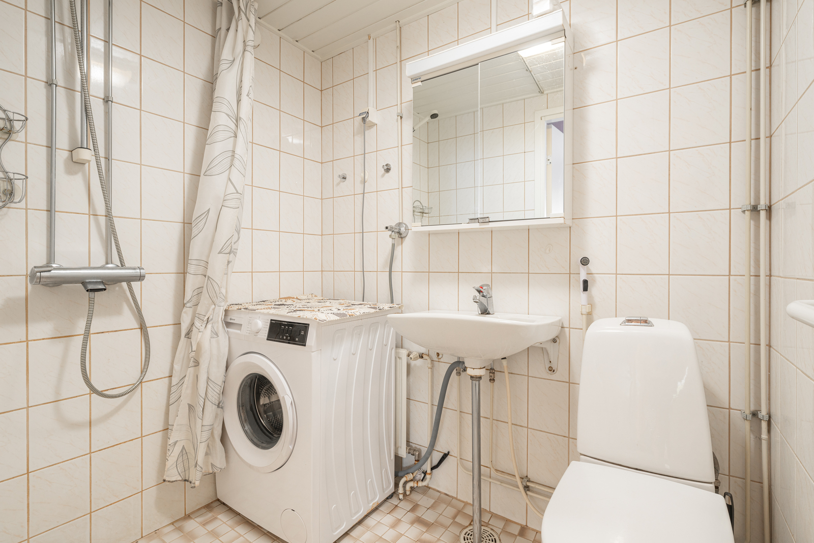 | Kylpyhuoneen kuvaus | WC-istuin, pesukoneliitäntä, suihku, peilikaappi ja kiinteät valaisimet, seinät (kaakeli), lattiat (laatta) |