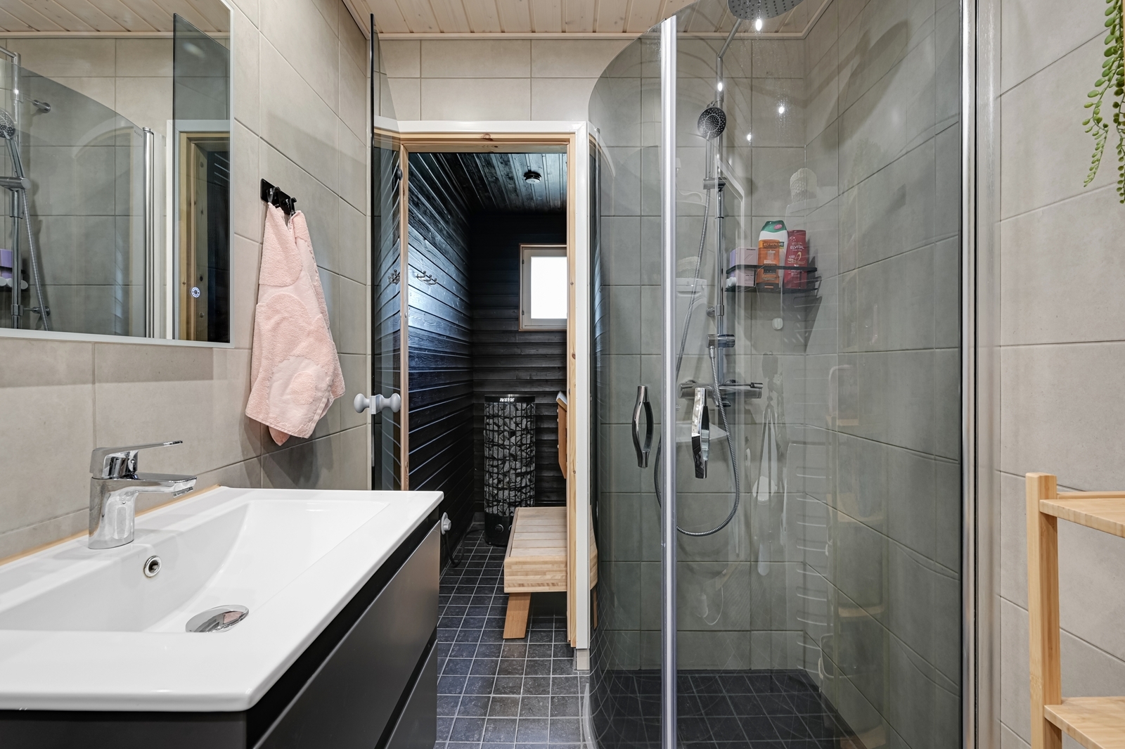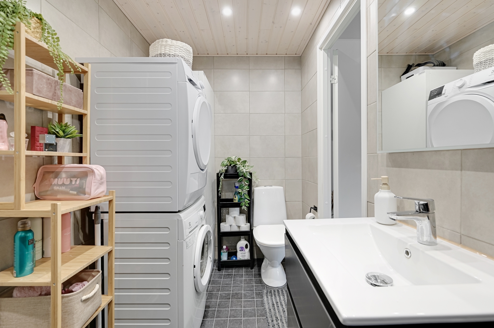 | Kylpyhuoneen kuvaus | Suihkuseinä, peili, pesukoneliitäntä ja suihku, seinät (kaakeli), lattiat (laatta) |
