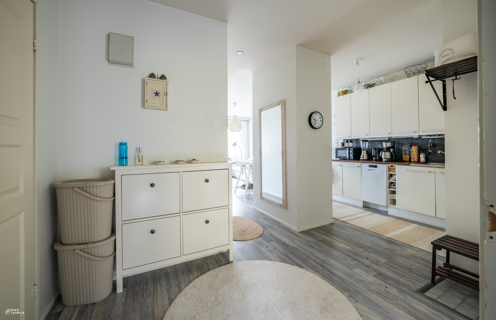Iso eteinen, jossa laminaattilattia ja seinät maalattu. |