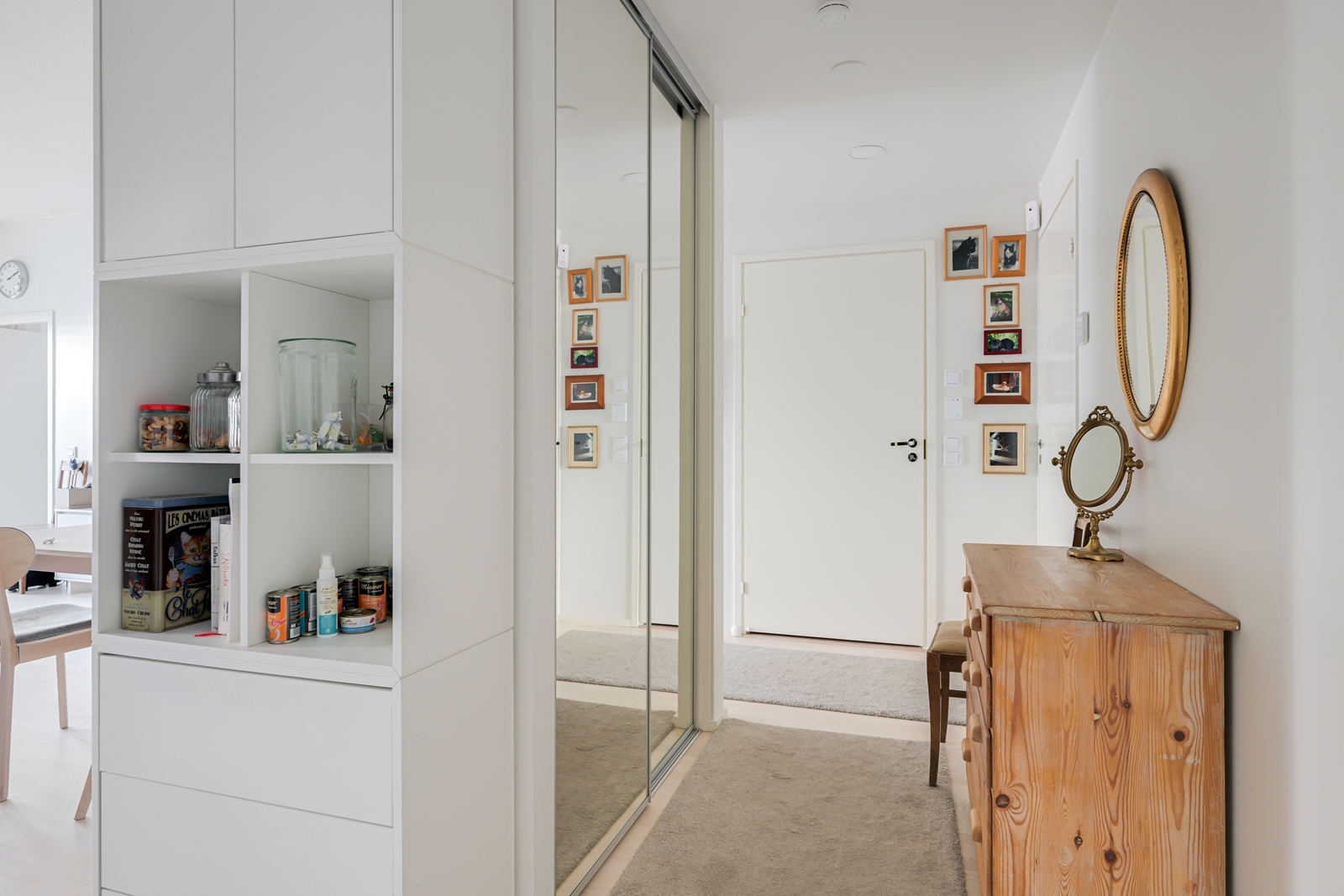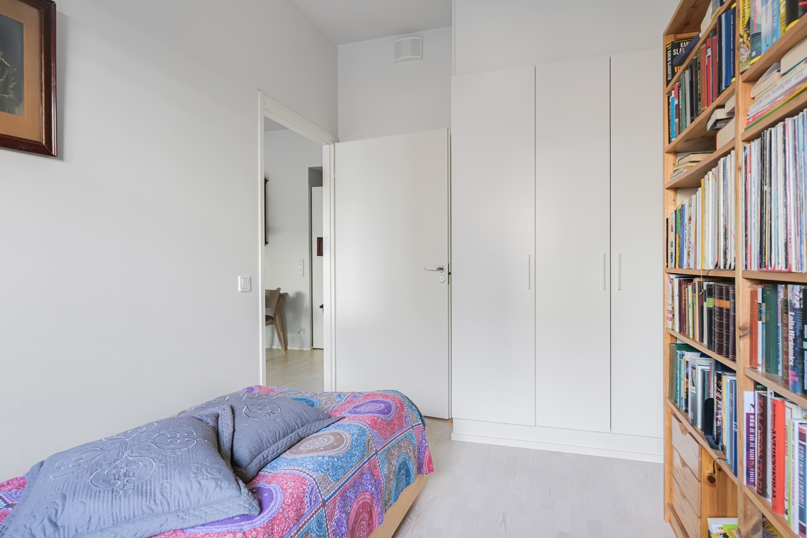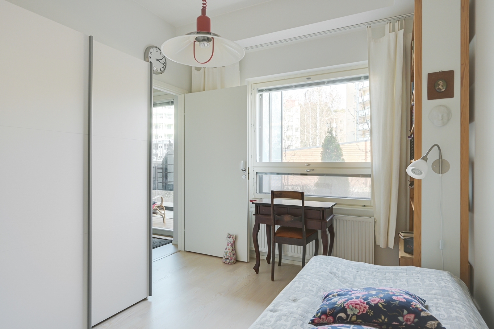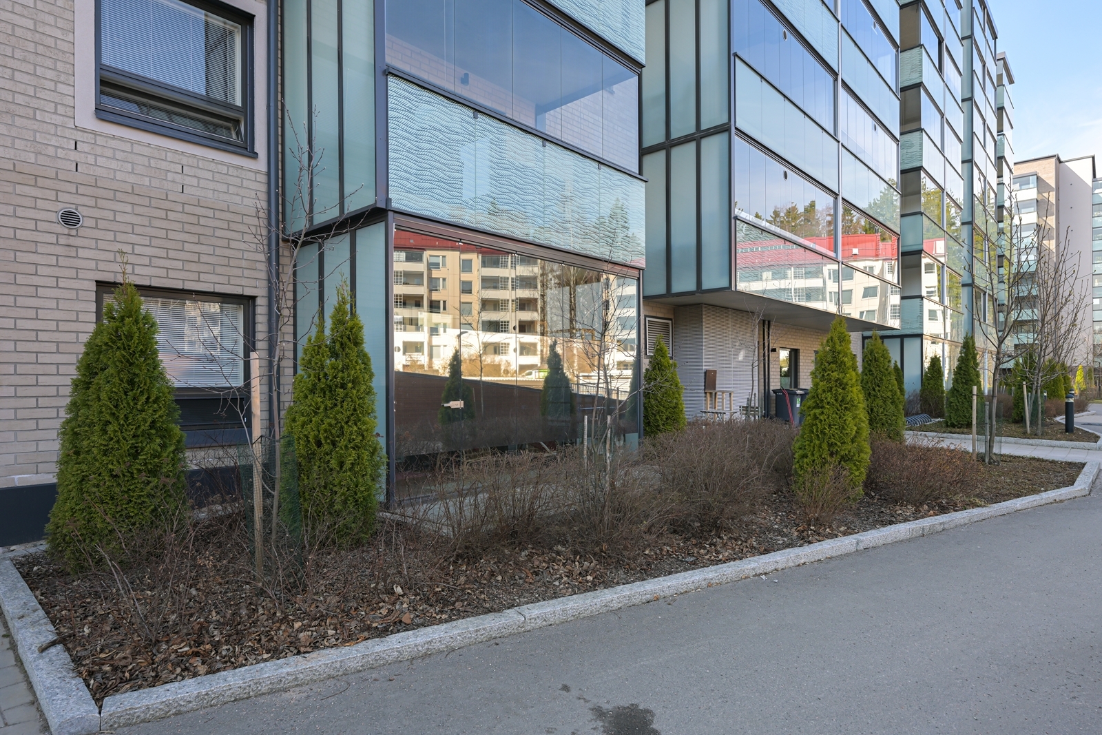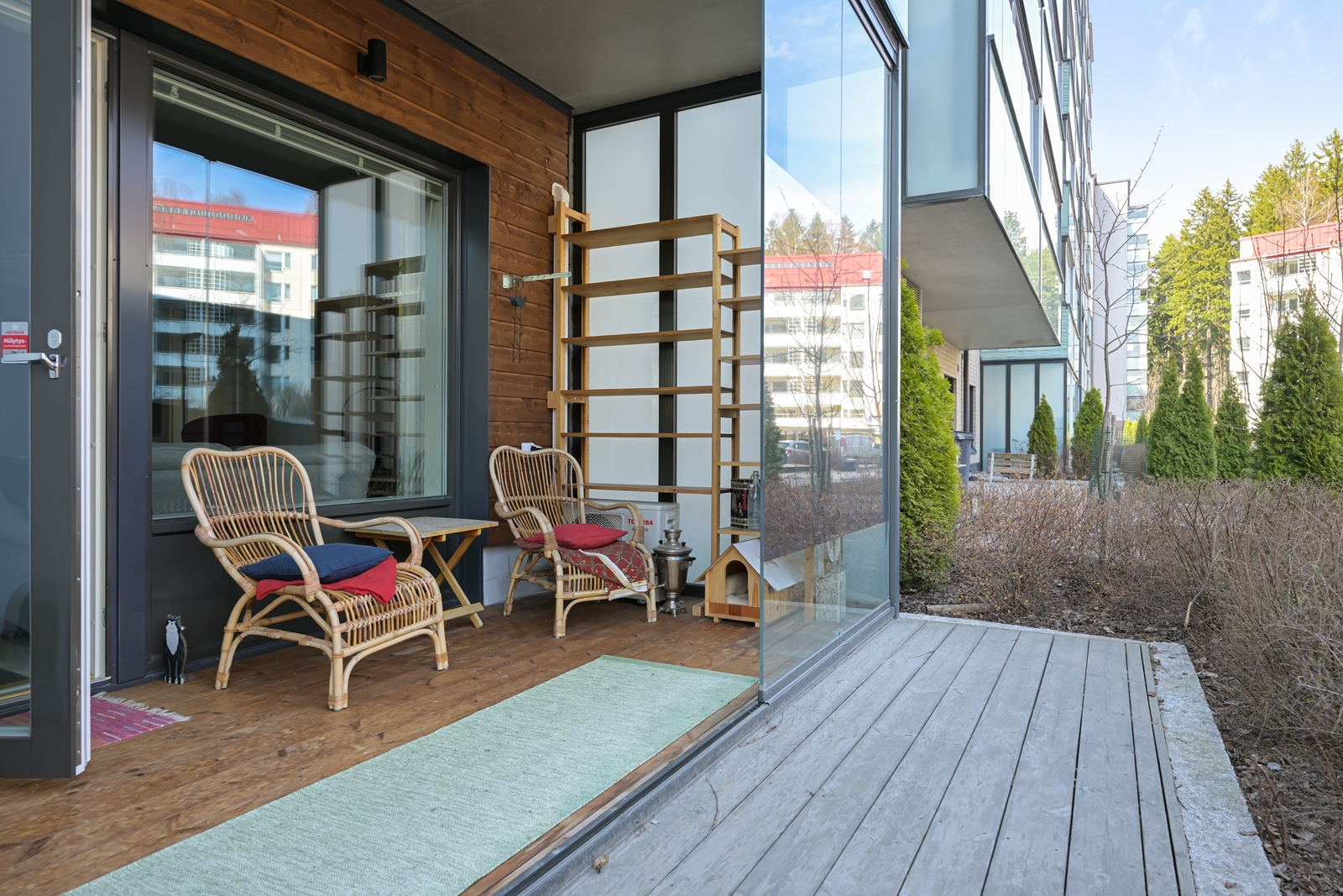 Olohuone on tilava ja sen yhteydessä on tilaan avautuva keittiö, sekä osittain lasitettu terassi. Makuuhuoneet ovat hyvänkokoisia ja molemmissa on säilytyskaappeja valmiina. Kylpyhuoneessa on paikka pesukoneelle ja säilytystilaakin on mukavasti. Eteisen yhteydessä on lisäksi erillinen wc sekä liukuovikaapisto. Kylpyhuoneen yhteydessä on alkujaan ollut sauna, mutta se on muutettu vaatehuoneeksi kiuas ja lauteet poistamalla. Lisäviihtyisyyttä tuovat terassilasien peilikalvot, jotka lisäävät yksityisyyttä asunnon ollessa maan tasalla sekä viilennyskone, jolla asunto pysyy sopivan lämpöisenä kesien kuumetessa.