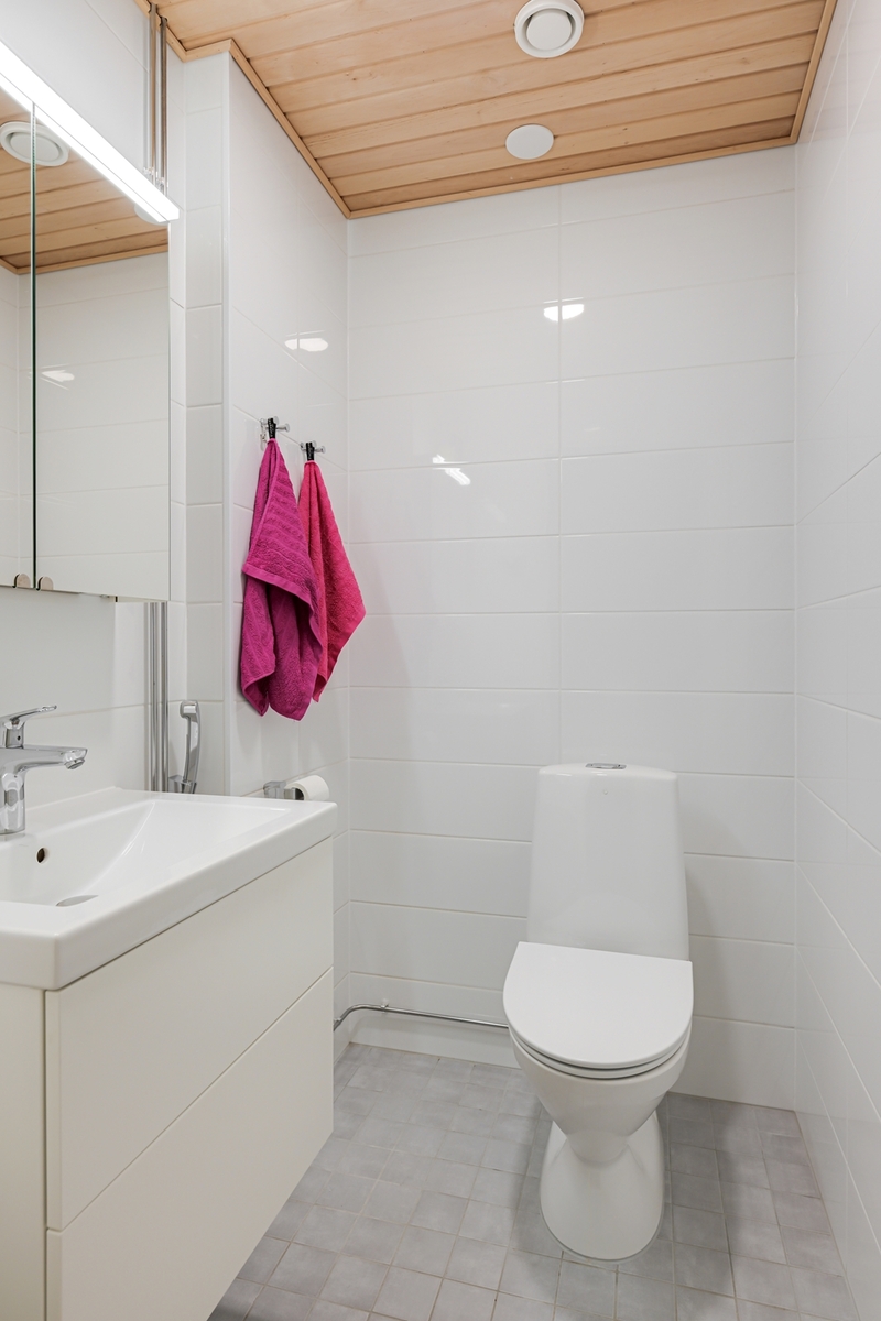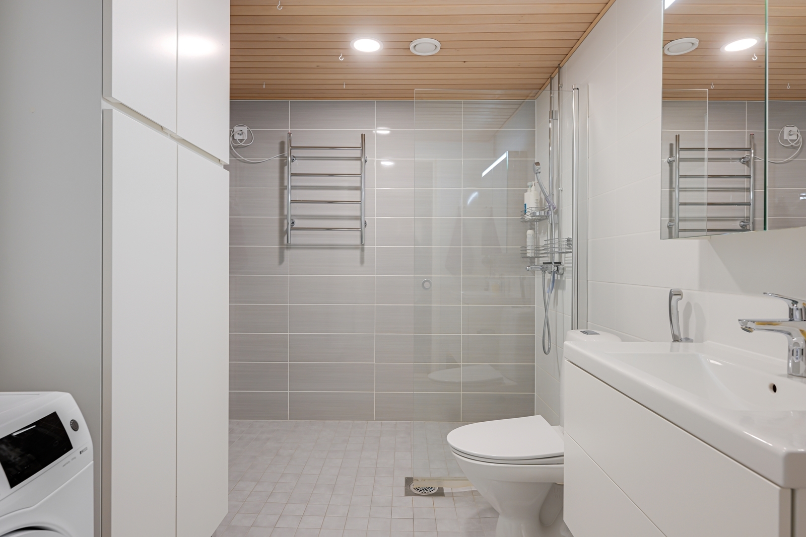 Suihkuseinä, allaskaappi, pesukoneliitäntä, lattialämmitys, pesukone, peilikaappi, wc-istuin ja suihku, seinät (kaakeli), lattiat (laatta) |