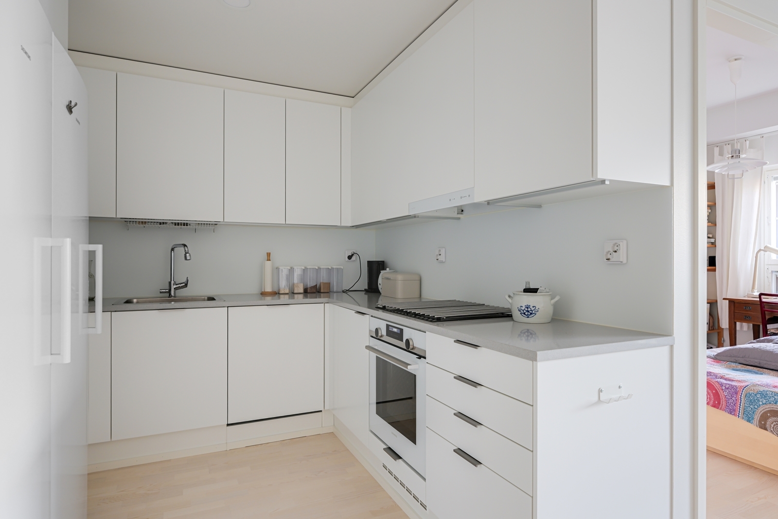 Liesi (Induktioliesi), työtasot (kivi), seinät (maali), lattiat (parketti), astianpesukone, liesituuletin, mikroaaltouuni, liesi, jääkaappi ja erillinen pakastin |