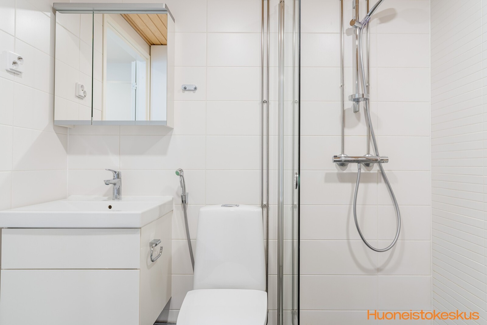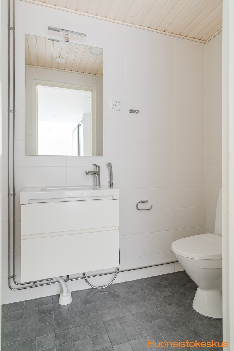 | Kylpyhuoneen kuvaus | WC-istuin, lattialämmitys, allaskaappi, peilikaappi, suihkuseinä, pesukoneliitäntä, suihku ja kiinteät valaisimet, seinät (kaakeli), lattiat (laatta) |