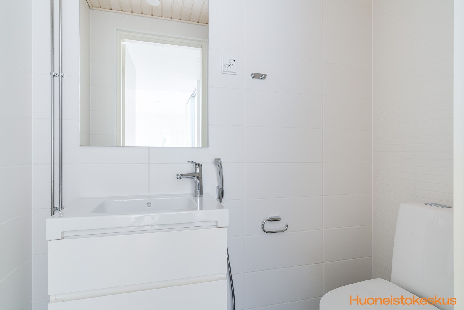 Kylpyhuoneeseen mahtuu hyvin pesukone.