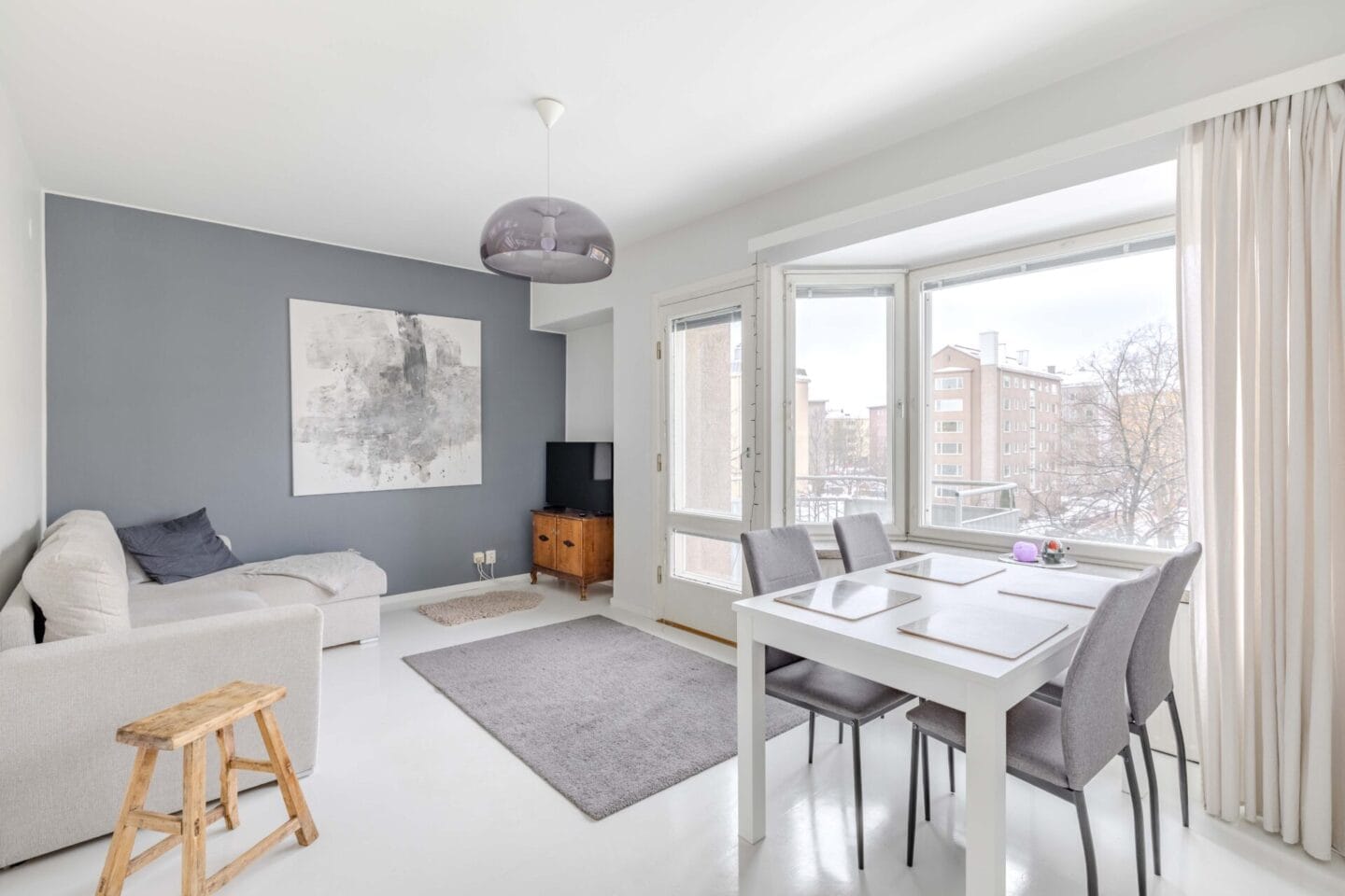 Asunnon ilmavat näkymät suurista ikkunoista Huopalahdentien yli tuovat tilan tuntua ja valoa. Ikkunallinen keittiö on kätevästi huoneiden välissä ja 2005 putkiremontissa uusittu kylpyhuone on syväpuhdistettu ja ehostettu saumojen ja valaistuksen osalta 2022.