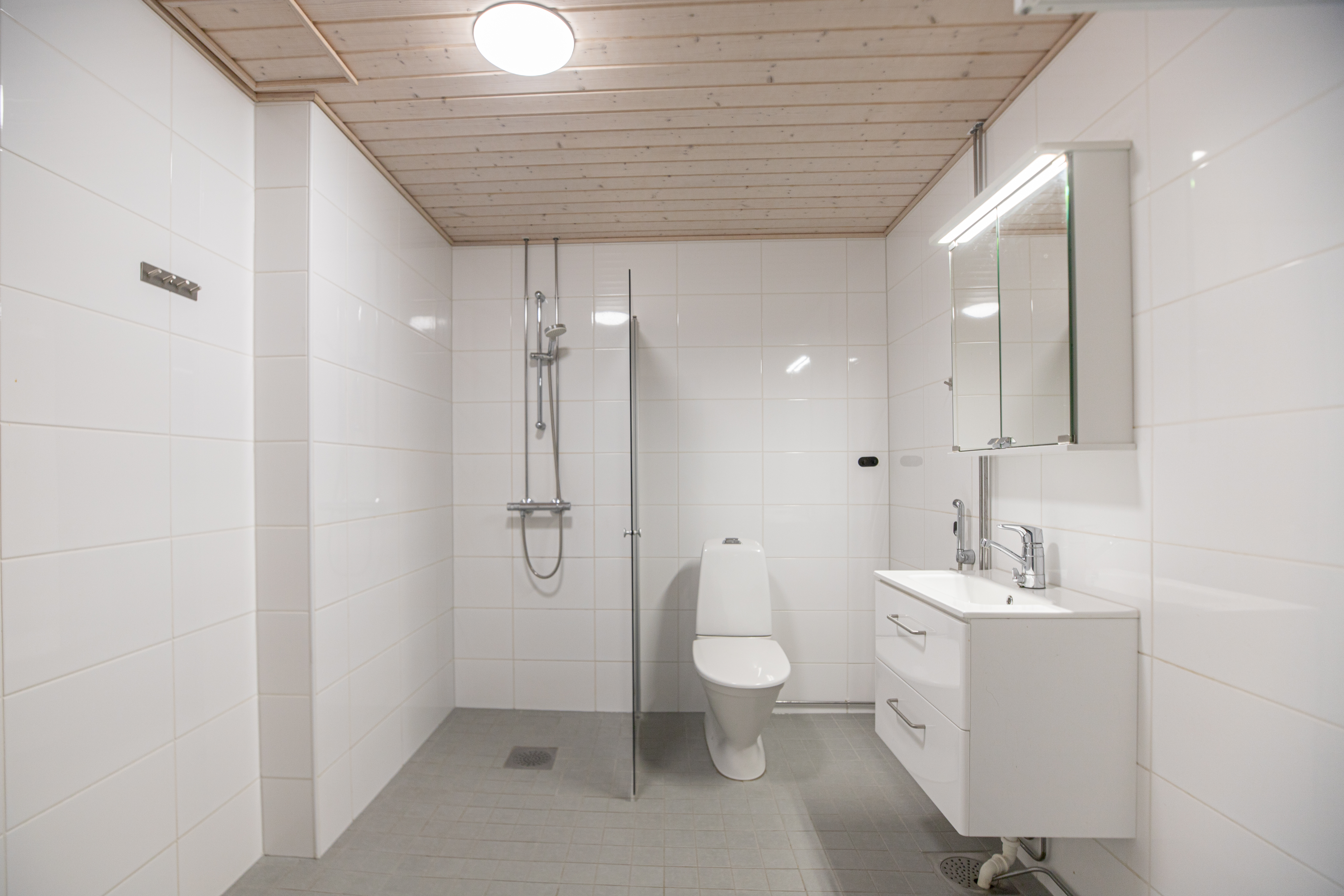 | Kylpyhuoneen kuvaus | WC-istuin, suihku, suihkuseinä, pesukoneliitäntä, lattialämmitys, peilikaappi, allaskaappi ja bidee-suihku, seinät (kaakeli), lattiat (laatta) |