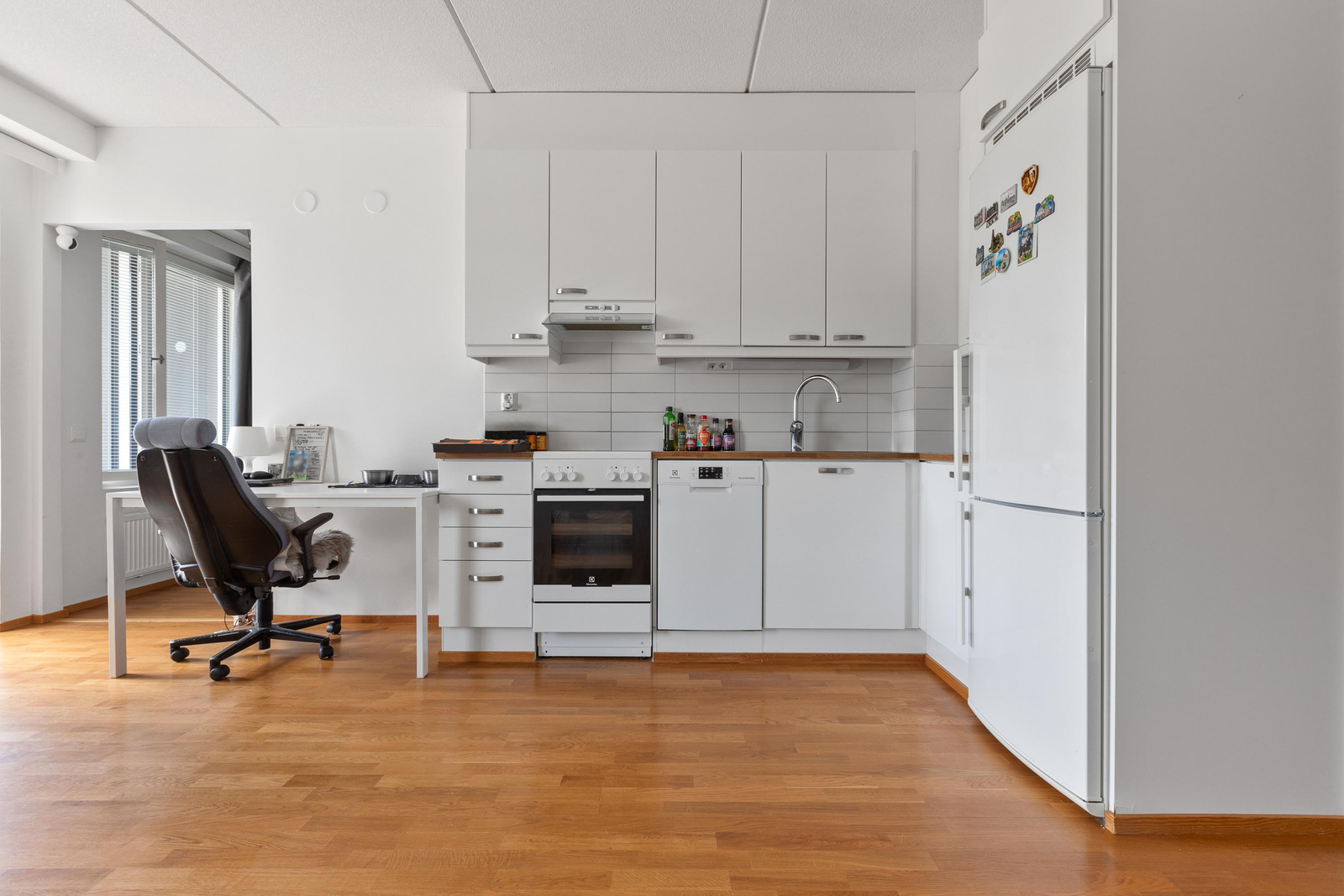 | Keittiön kuvaus | Liesi (Keraaminen liesi), seinät (maali), lattiat (parketti), astianpesukone, liesituuletin ja jääkaappipakastin |