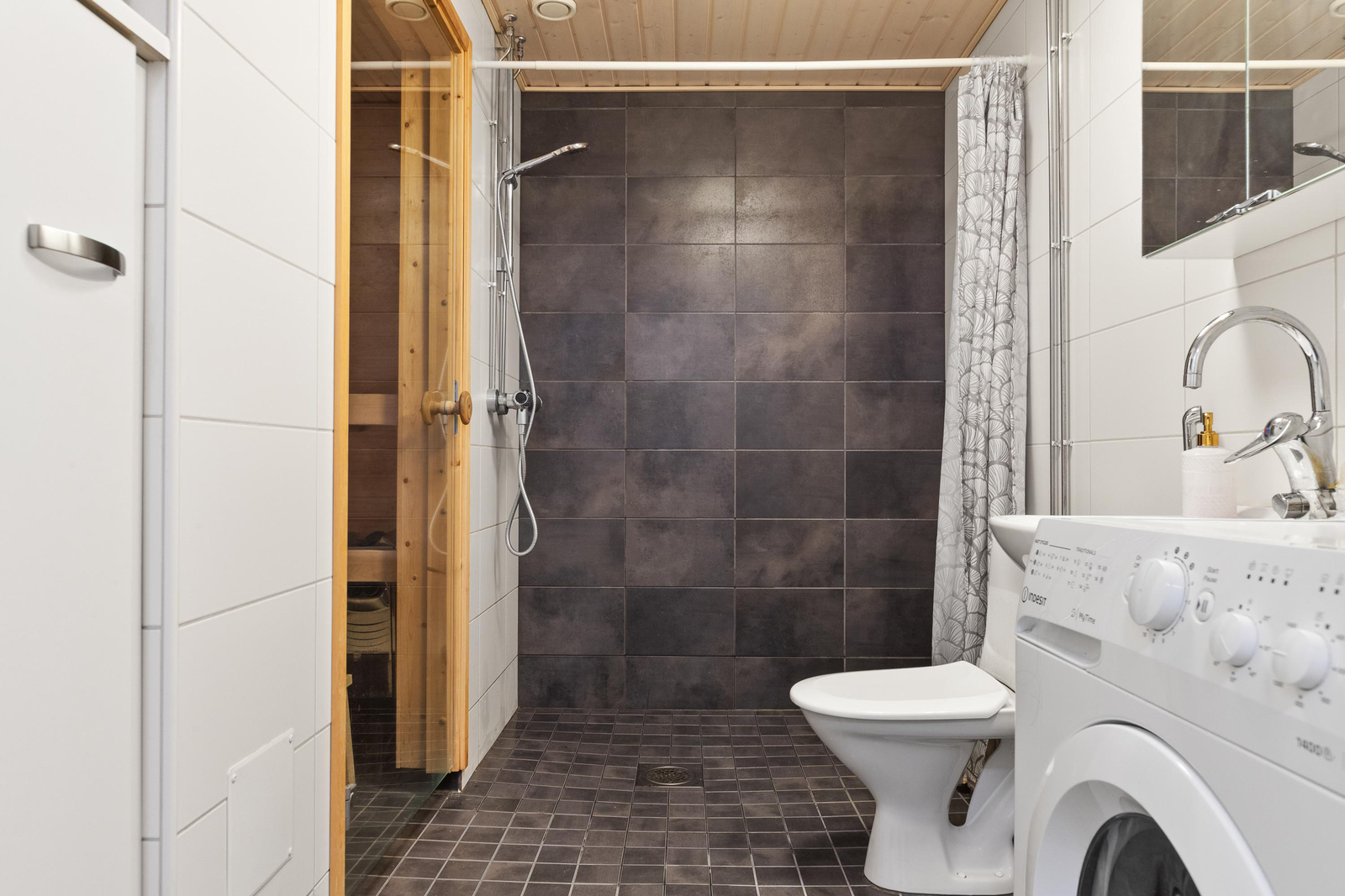 | Kylpyhuoneen kuvaus | Peilikaappi, pesukoneliitäntä, suihku ja wc-istuin, seinät (kaakeli), lattiat (laatta) |