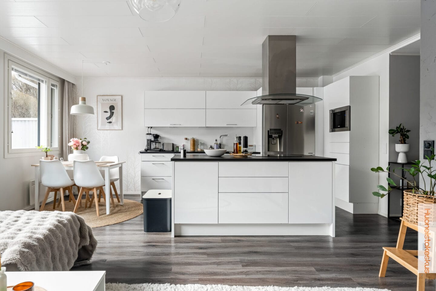 | Keittiön kuvaus | Liesi (Induktioliesi), työtasot (laminaatti), seinät (tapetti), lattiat (vinyyli), astianpesukone (uusittu v.2023), jääkaappi, erillinen pakastin, erillisuuni, liesi, liesituuletin ja mikroaaltouuni |