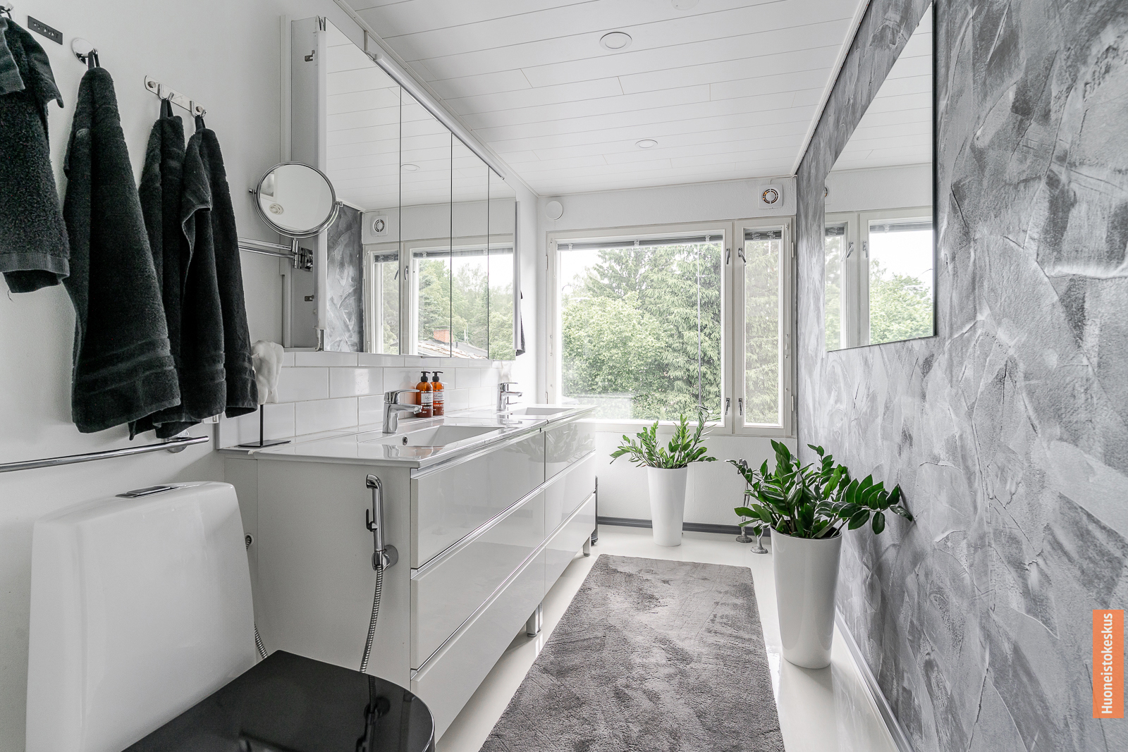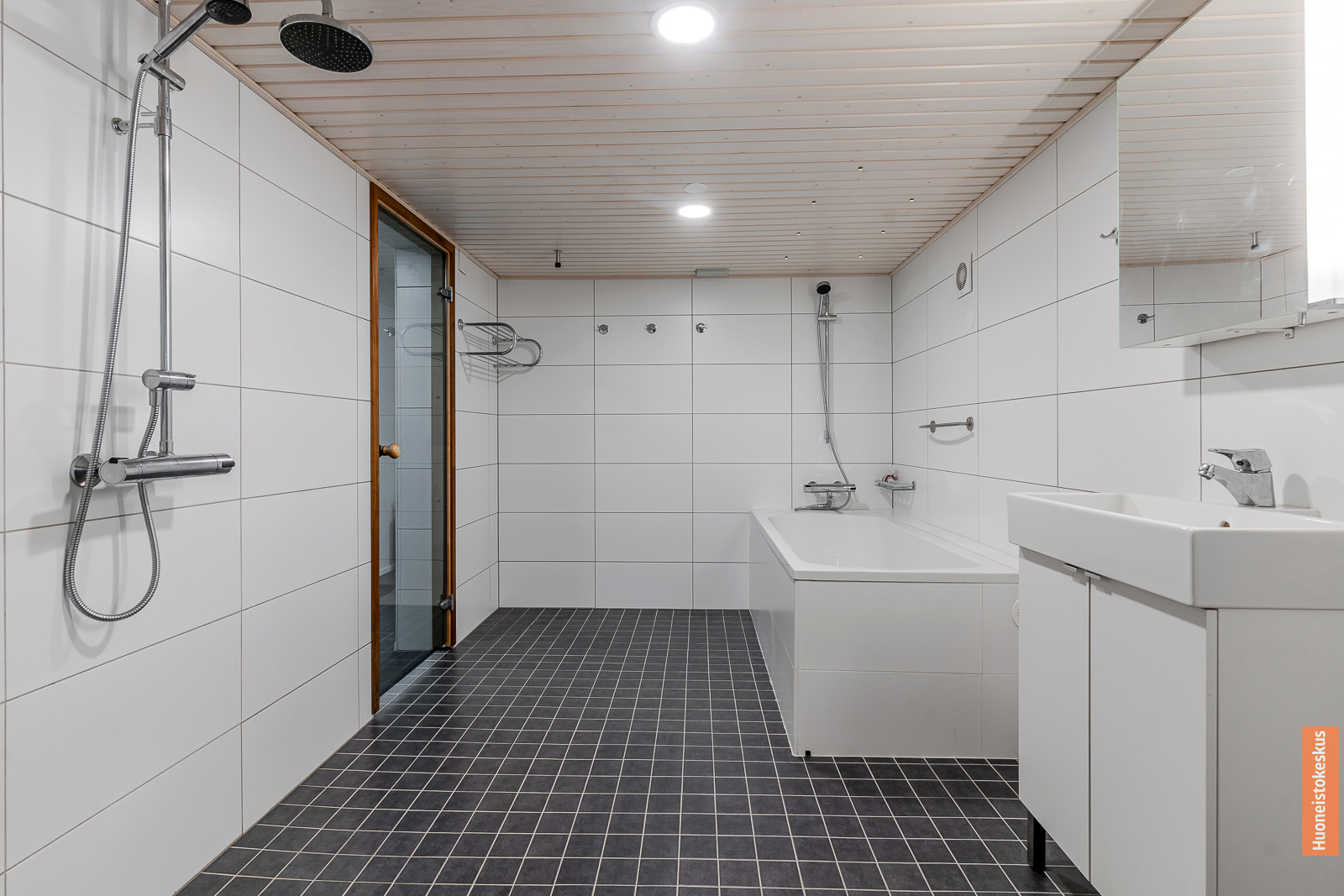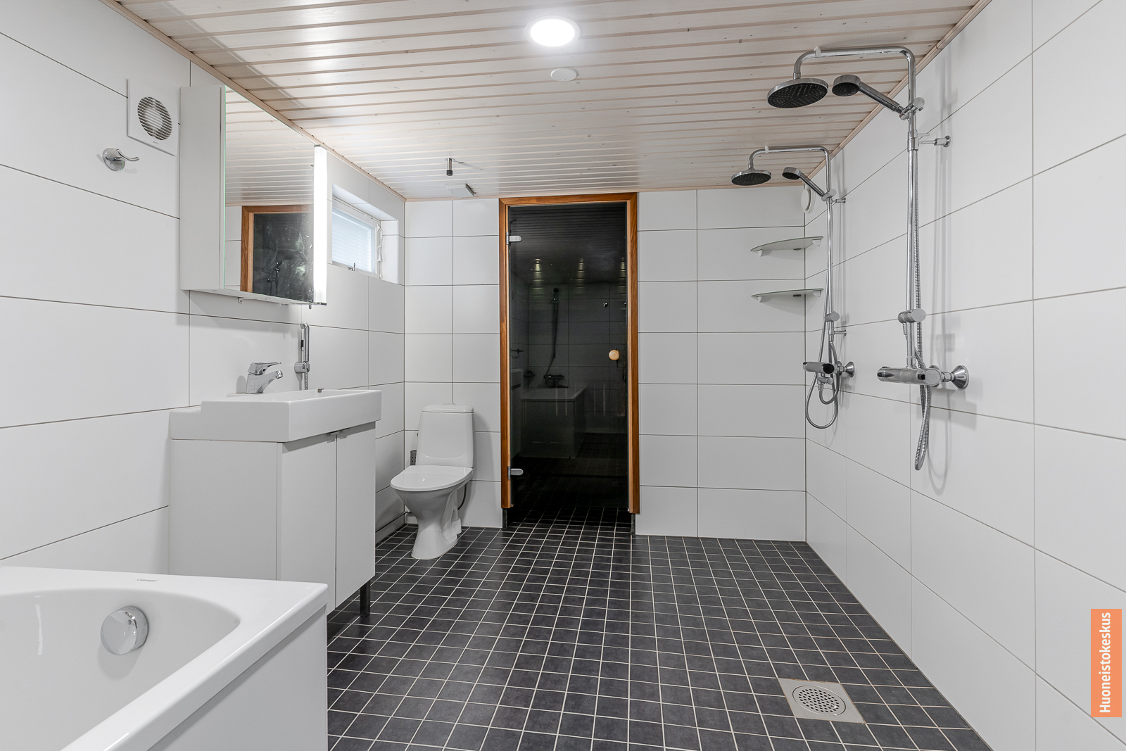 | Kylpyhuoneen kuvaus | Allaskaappi, lattialämmitys, peilikaappi, wc-istuin, suihku ja kiinteät valaisimet, seinät (kaakeli), lattiat (laatta) |