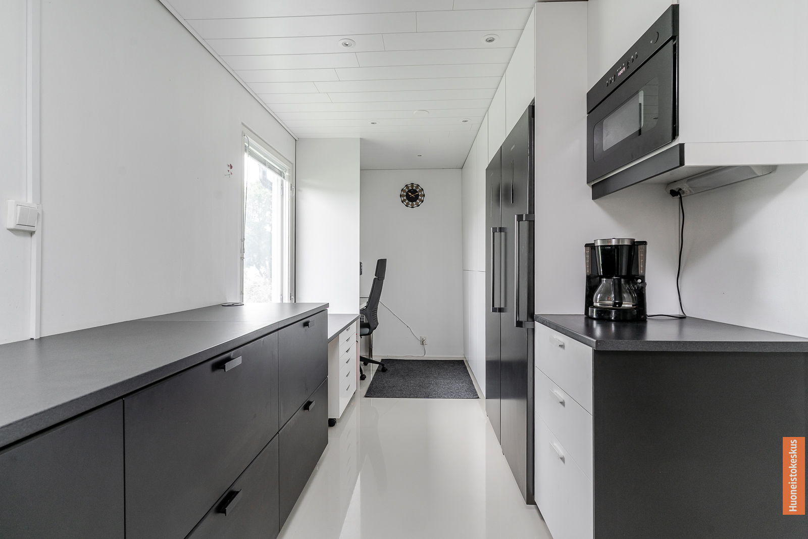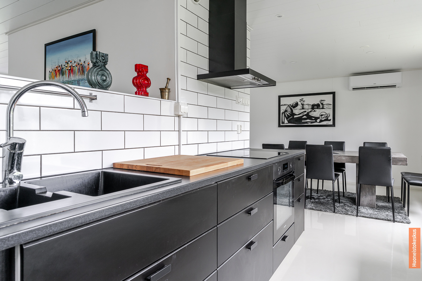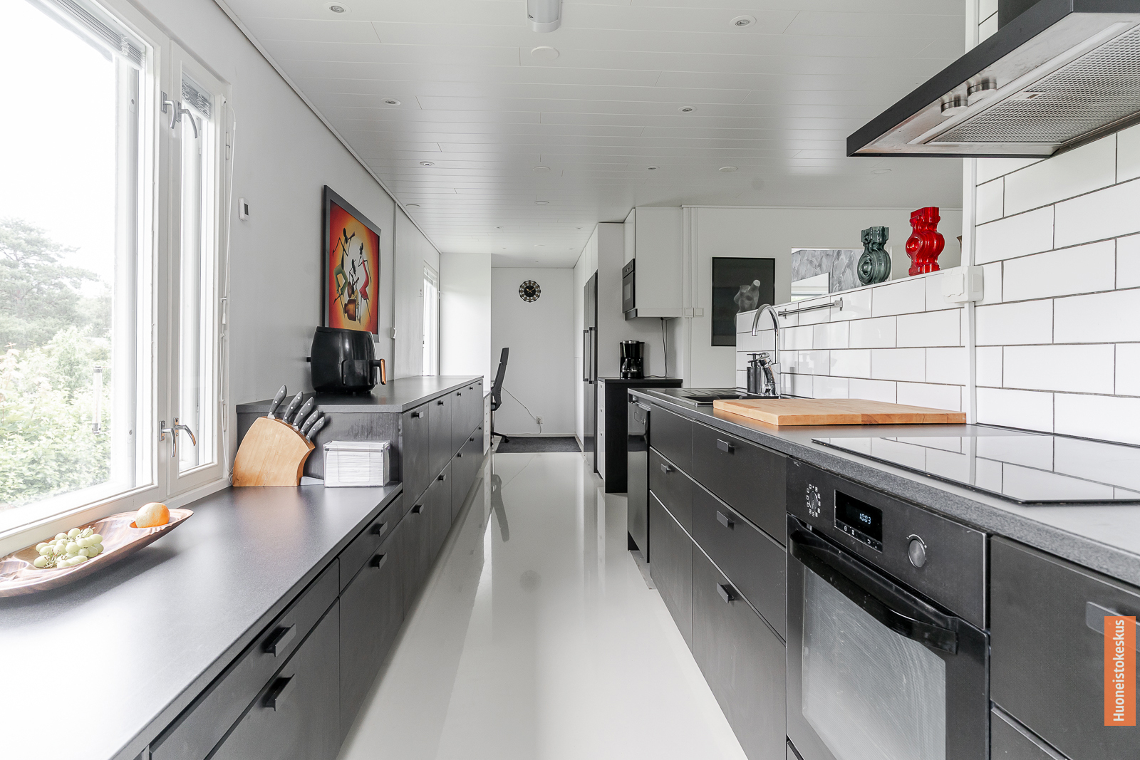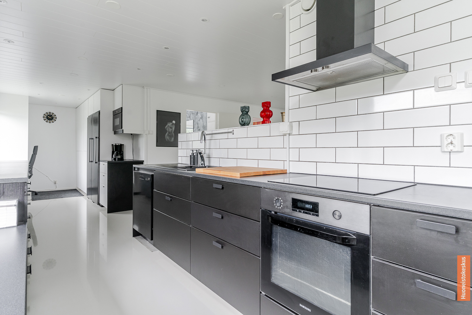 | Keittiön kuvaus | Liesi (Keraaminen liesi ja integroitu, erillisuuni), työtasot (laminaatti), seinät (laatta ja maali), astianpesukone, liesituuletin, erillisuuni, mikroaaltouuni, jääkaappi, erillinen pakastin ja kiinteät valaisimet |