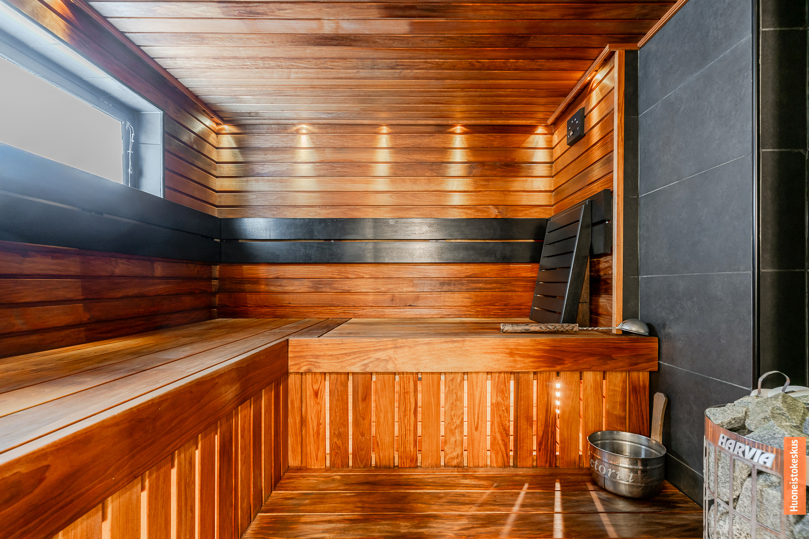| Saunan kuvaus | Seinät (puu ja kaakeli), lattiat (laatta), Sähkökiuas |