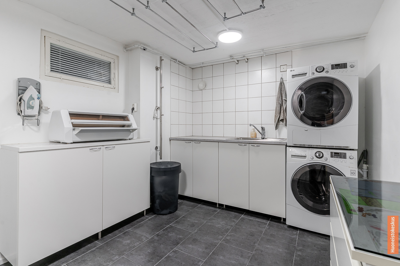 | Kodinhoitohuoneen kuvaus | Pesuallas, pesukoneliitäntä, lattiakaivo, lattialämmitys ja pyykkikaapit, lattiat (laatta), seinät (maali) |