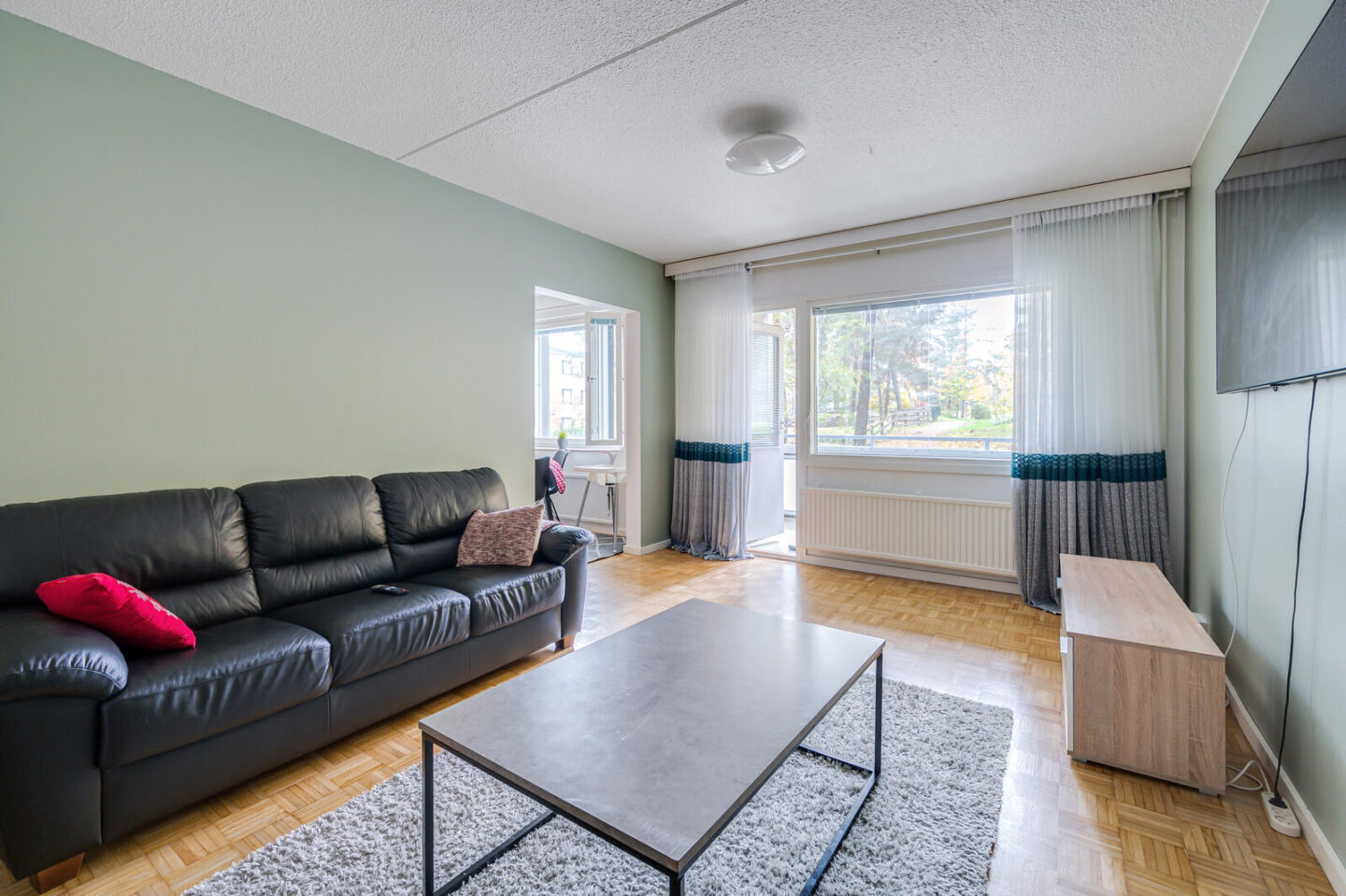 Tässä hissitalon ensimmäisen kerroksen (ei maan tasalla) päätyhuoneistossa on toimiva, kompakti pohjaratkaisu pienperheelle. Kaksi tilavaa makuuhuonetta ja avara olohuone, jonka jatkeena on lasitettu parveke ilmansuuntana länsi. Parvekkeelta pääset seuraamaan lastenleikkejä vehreässä suojaisassa pihapiirissä. Tilava keittiö, jonka vieressä ruokailutila. Tämä on hyvä valinta niin ensiasunnoksi kuin myöhäisempäänkin elämän vaiheeseen tai vaikkapa sijoituskohteeksi. Asunto on siistissä kunnossa.