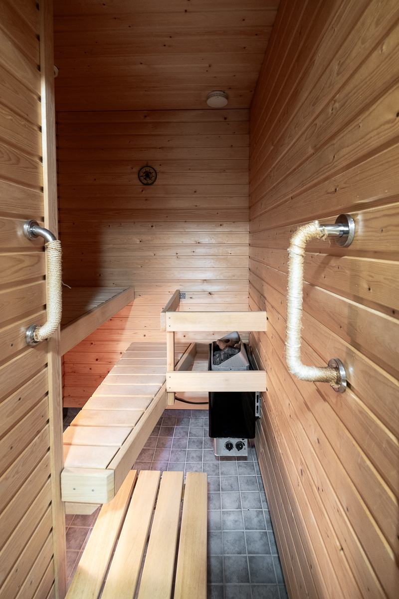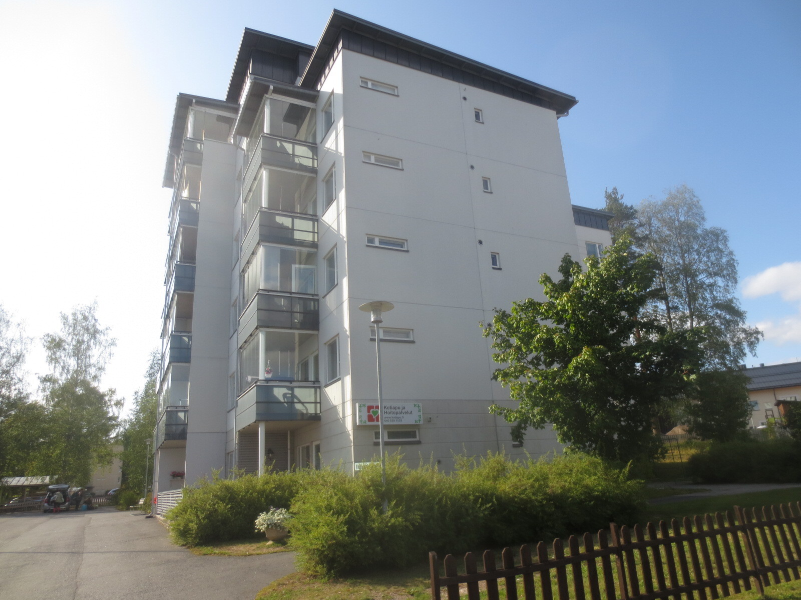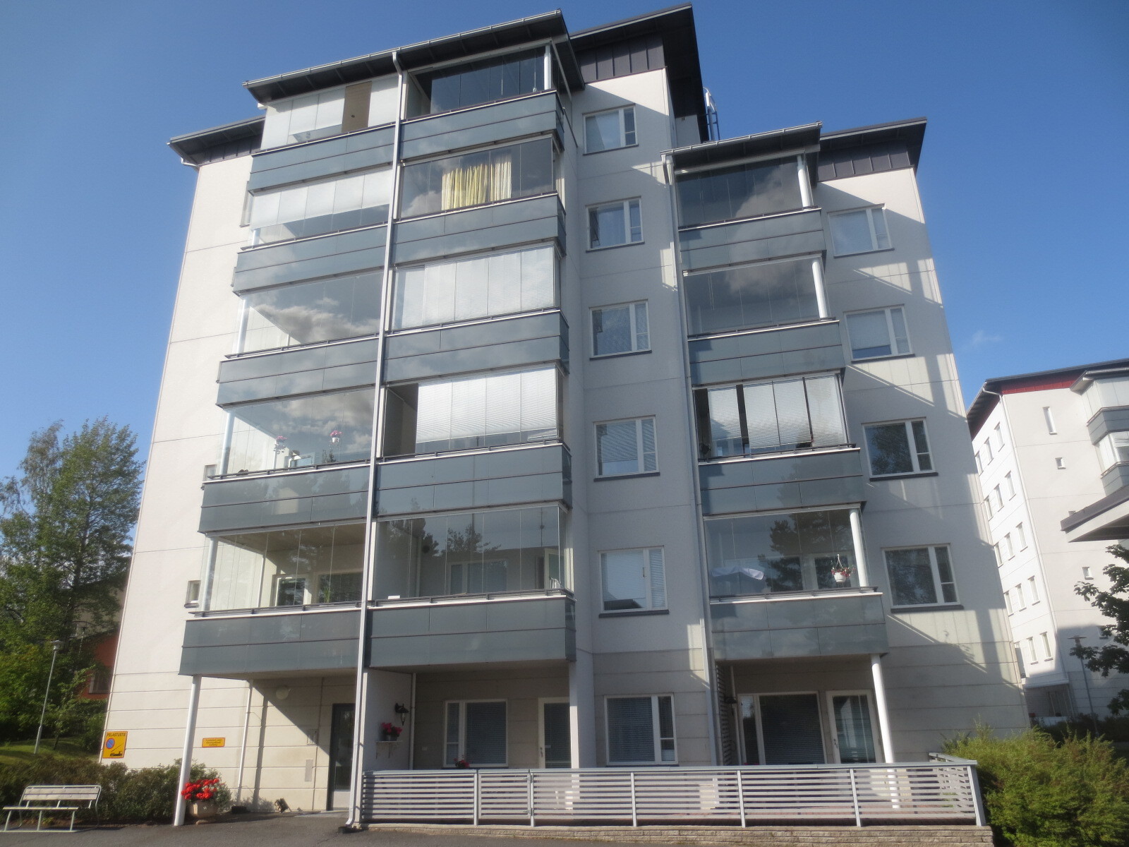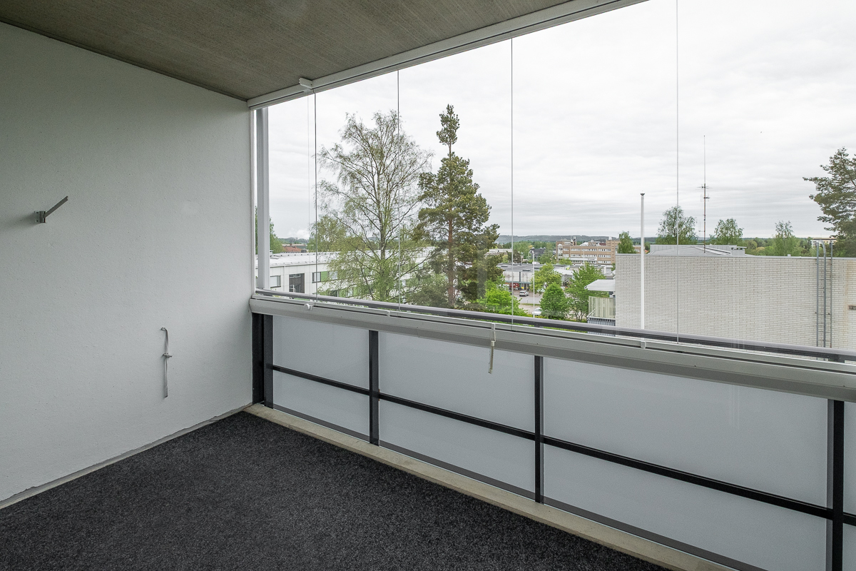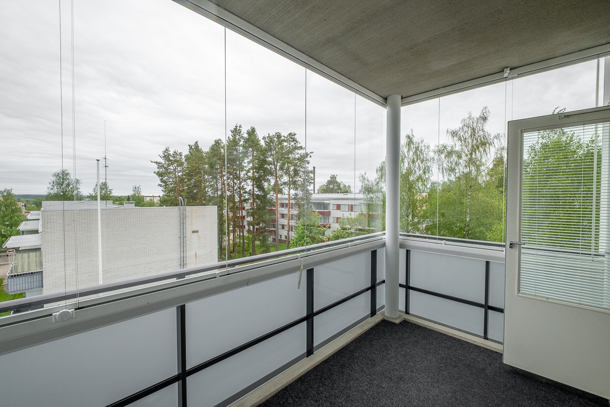 Lasitetulta parvekkeelta upea näköala Äänekosken keskustaan. Oma sauna lisää asumisviihtyvyyttä.