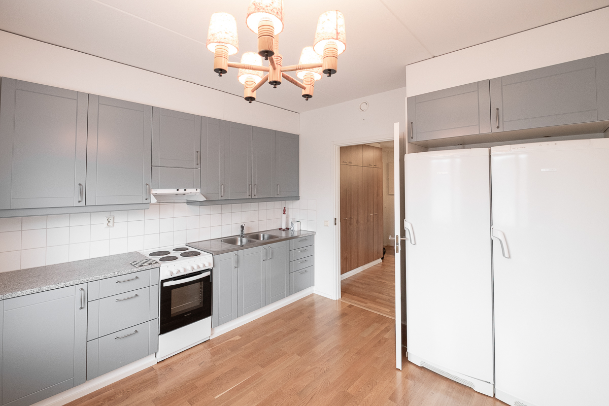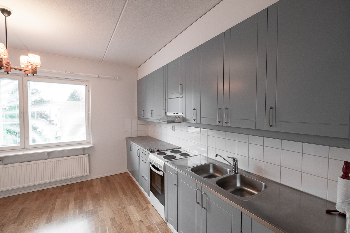 | Keittiön kuvaus | Liesi (sähköliesi), työtasot (laminaatti), seinät (maali), lattiat (parketti), liesi, jääkaappi, erillinen pakastin ja liesituuletin / hormi, varattu paikka astianpesukoneelle |