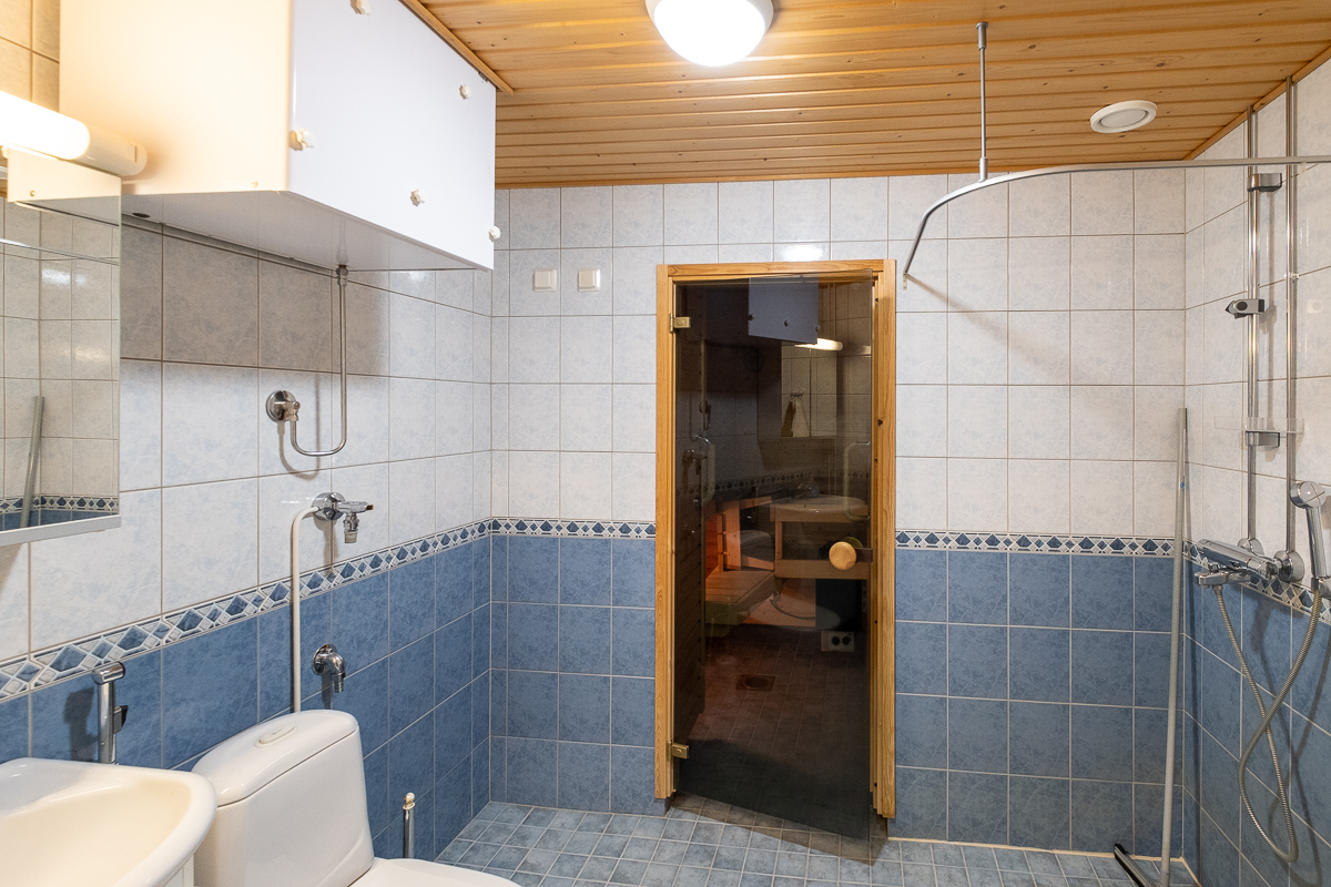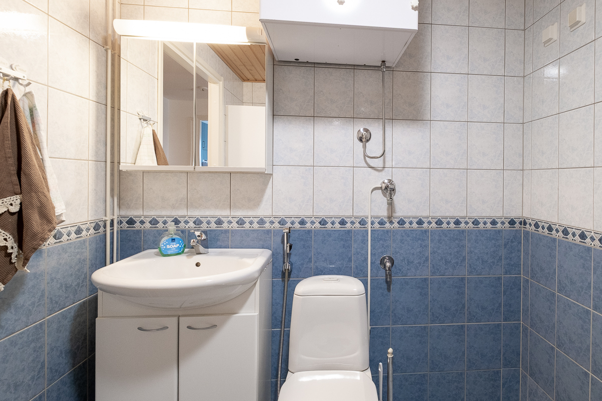 | Kylpyhuoneen kuvaus | Pesukoneliitäntä, lattialämmitys, wc-istuin ja suihku, seinät (kaakeli), lattiat (laatta) |