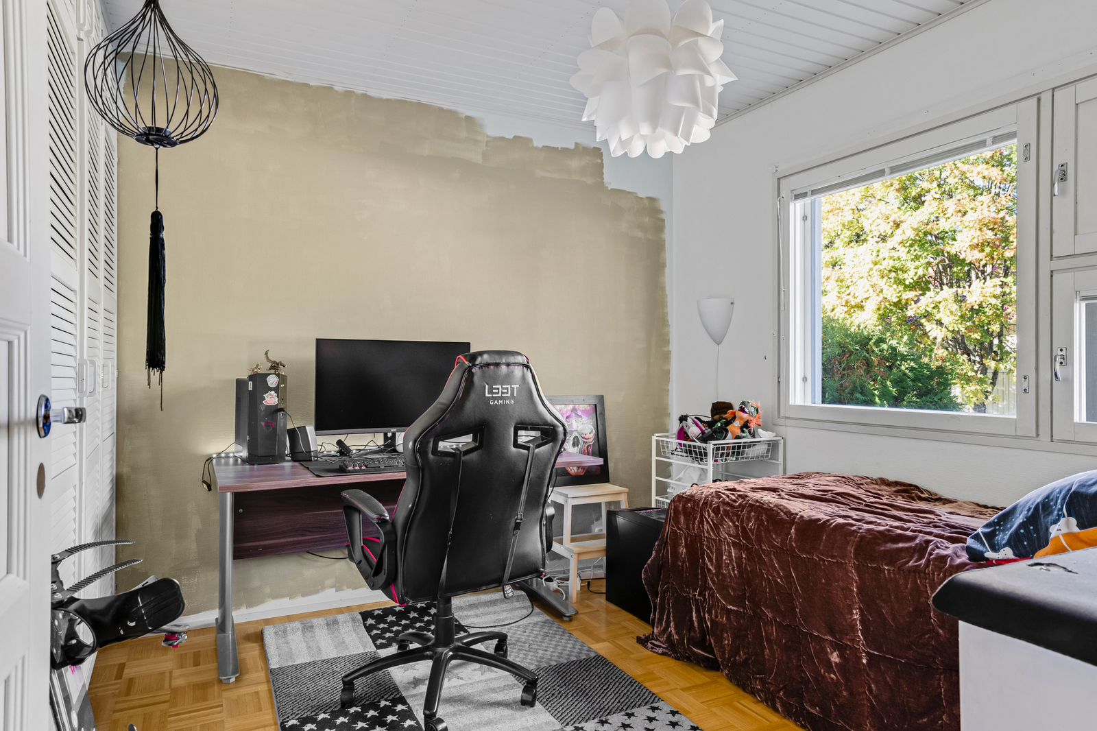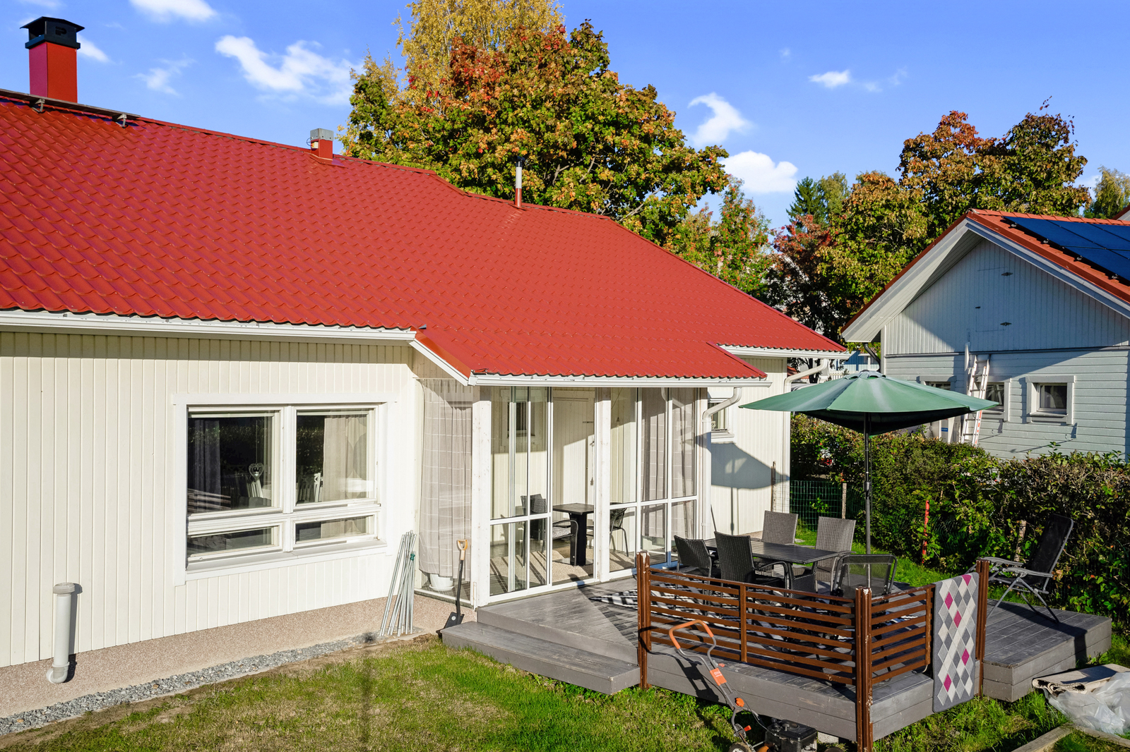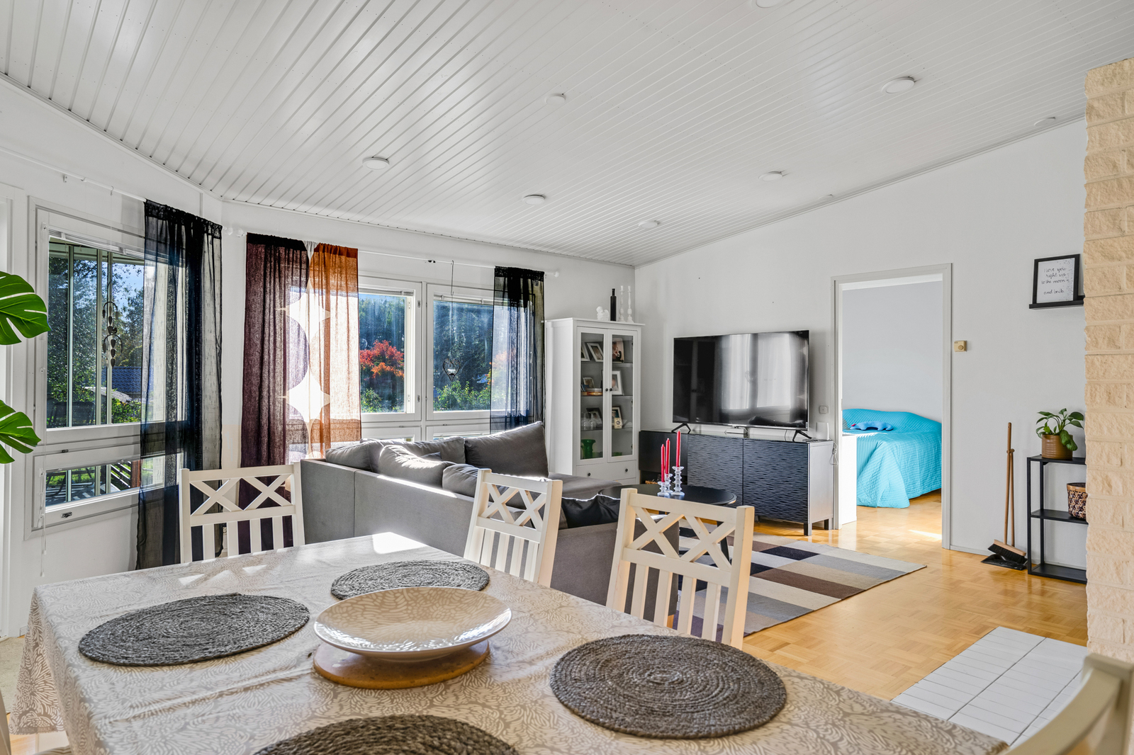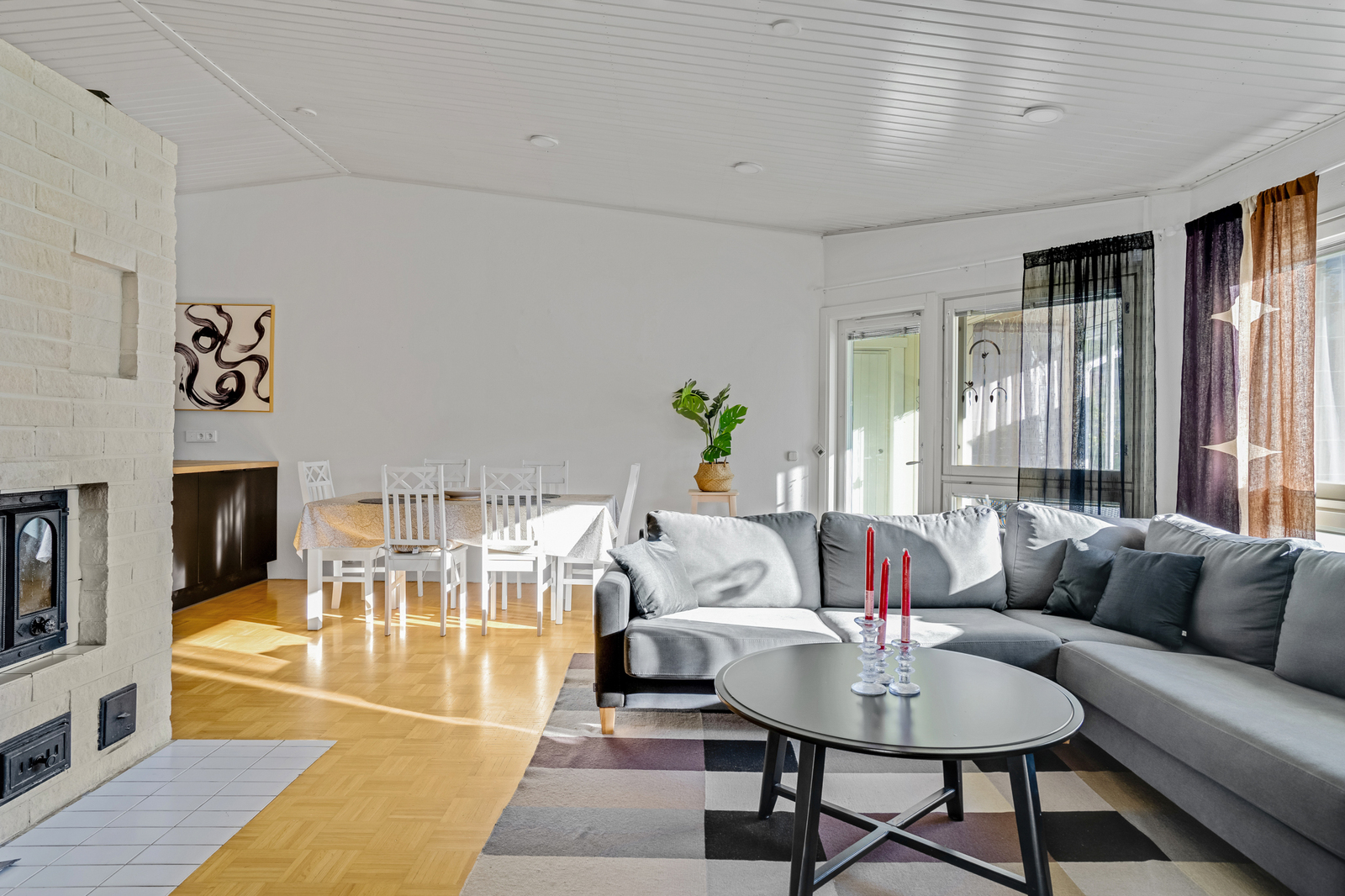 Toimiva pohjaratkaisu, kolme makuuhuonetta ja tilava olohuone. Keittiö remontoitu 2022, modernit Puustellin kalusteet ja uudet kodinkoneet. Olohuoneen ja keittiön välissä saareke. Kaksi erillistä wc:tä, sisäänkäynti myös kodinhoitohuoneen kautta. Kodinhoitohuone, kylpyhuone ja sauna remontoitu 2013, kylppärissä kaksi suihkua. Sähkölämmityksen lisäksi varaava takka. Olohuoneesta käynti lasitetulle terassille ja suojaiselle pihalle. Talon yhteydessä autotalli ja varasto. Edullinen kaupungin vuokratontti.