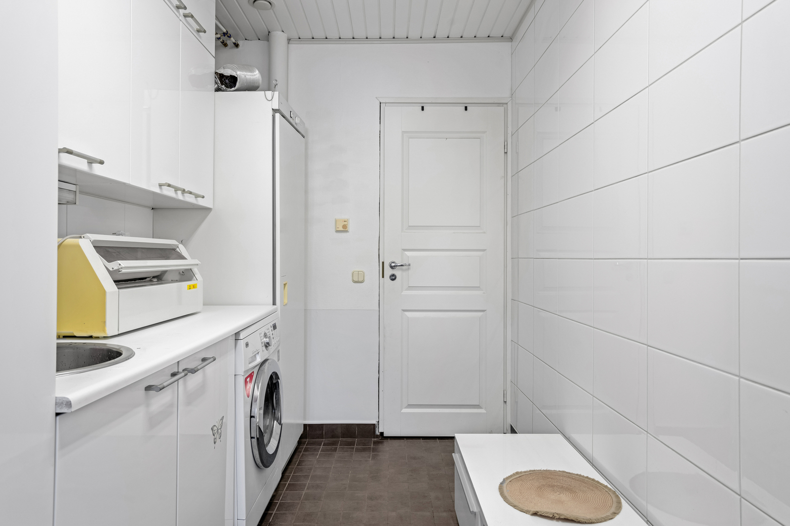 Pesuallas, pesukoneliitäntä, kuivauskaappi ja lattialämmitys, lattiat (laatta), seinät (maali ja kaakeli), kaapistot, työtaso. |