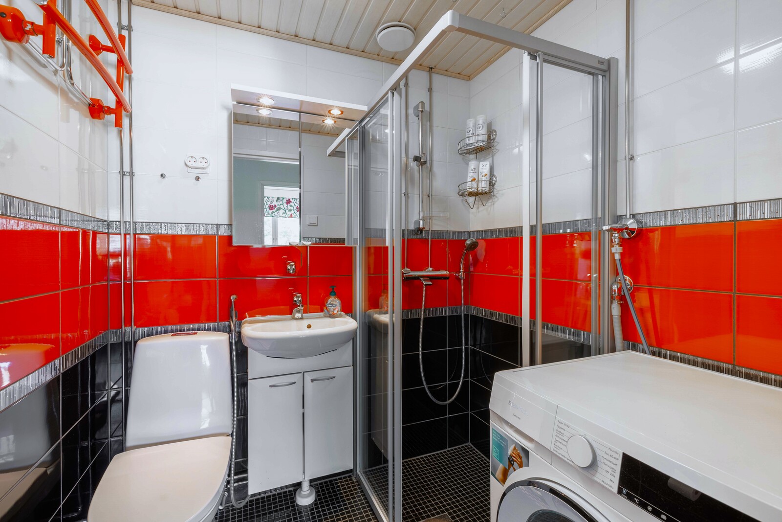 | Kylpyhuoneen kuvaus | Lattialämmitys, peilikaappi, suihkuseinä, suihku, wc-istuin, allaskaappi ja pesukoneliitäntä, seinät (kaakeli), lattiat (laatta) |
