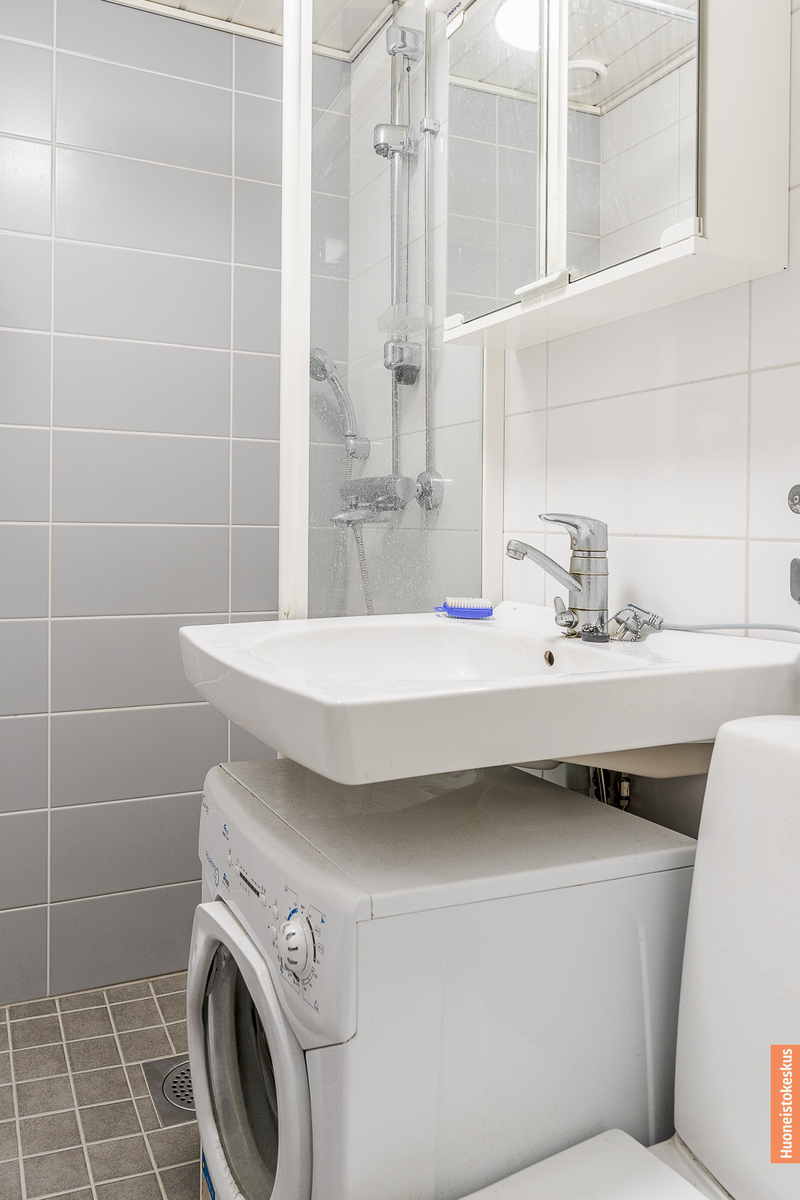 WC-istuin, lattialämmitys, peilikaappi, allaskaappi, suihkuseinä ja kiinteät valaisimet, seinät (kaakeli), lattiat (laatta) |