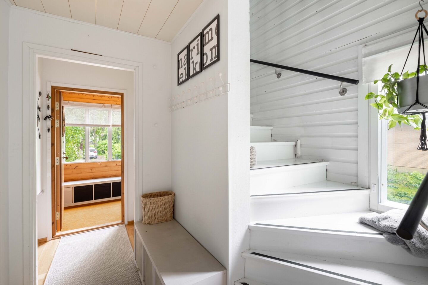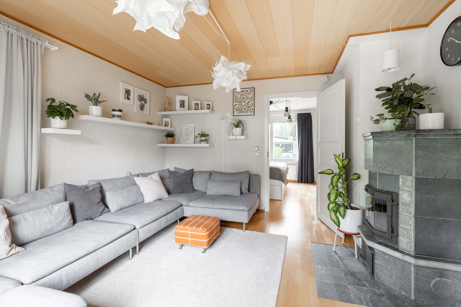 Sisään astutaan verannan kautta eteiseen, josta on käynti tilavaan, erilliseen keittiöön. Keittiössä on hyvin työskentelytilaa sekä paikka ruokailuryhmälle, täydellinen niin arkeen kuin yhteisiin hetkiin. Valoisa olohuone avautuu kahteen suuntaan ja tarjoaa runsaasti luonnonvaloa. Varaava takka luo lämpöä ja kodikasta tunnelmaa.
