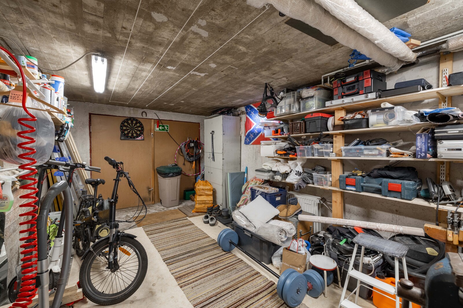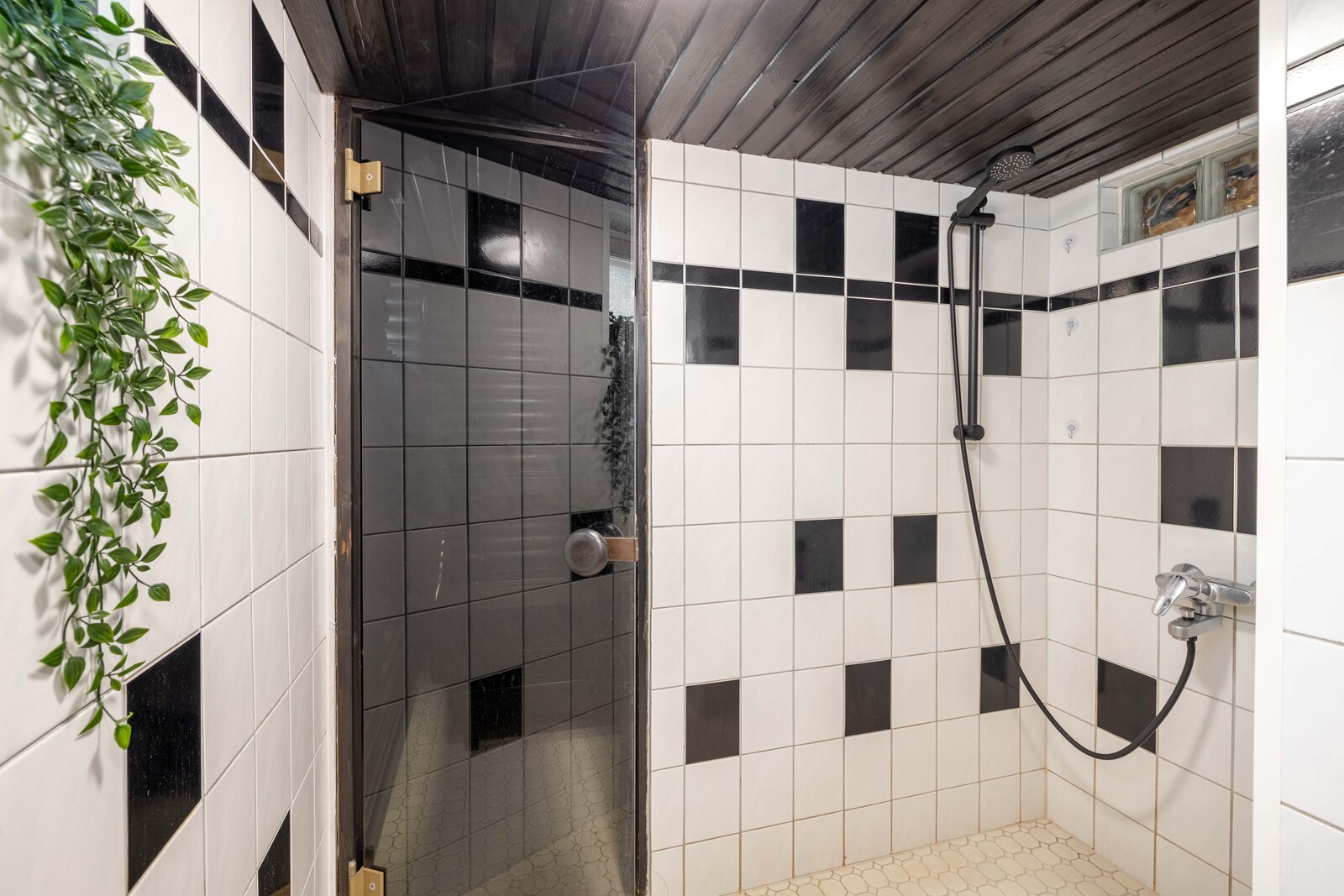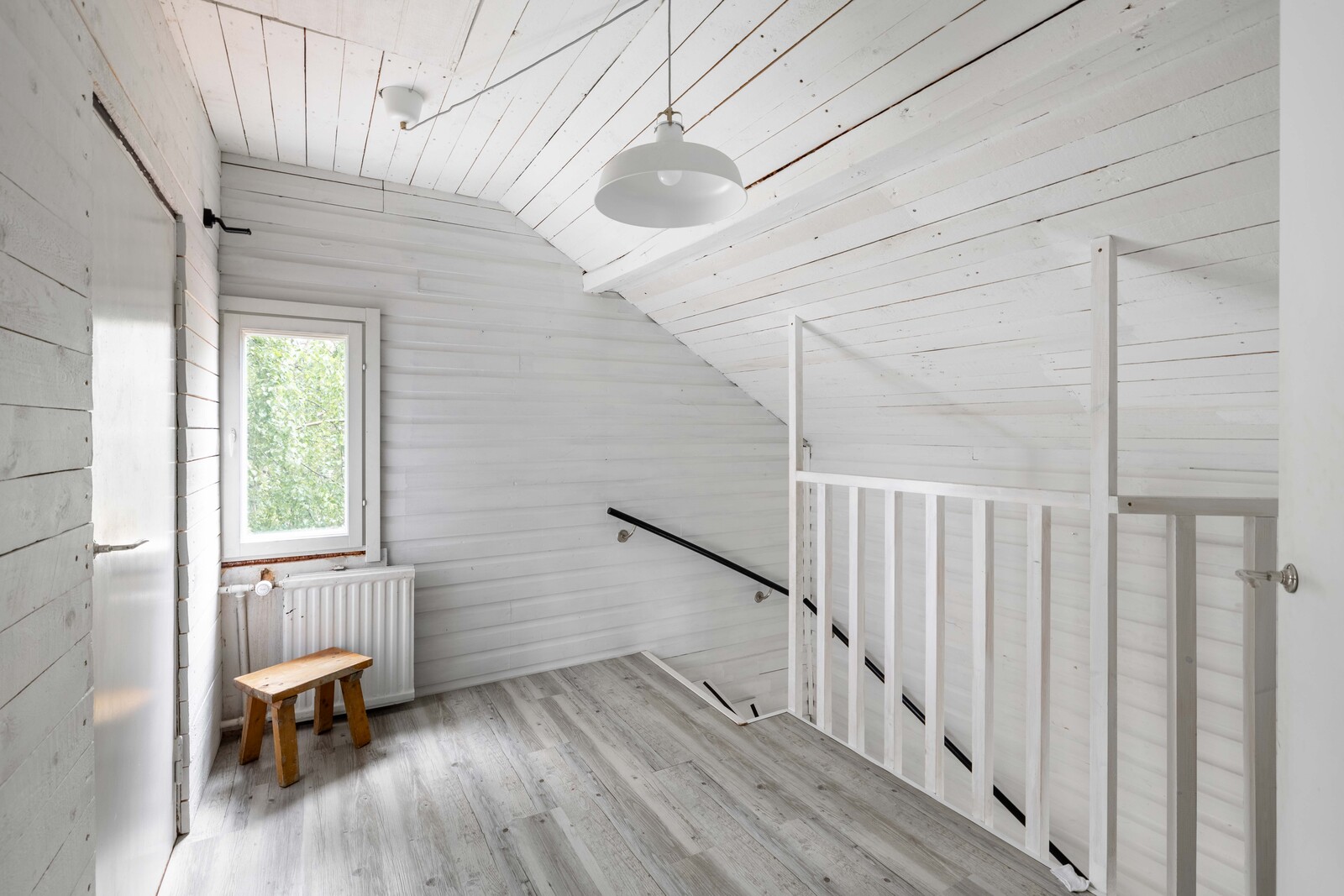Makuuhuoneita on yhteensä kolme, joista kaksi yläkerrassa. Yläkerrassa on myös runsaasti säilytystilaa, lapetilat on otettu tehokkaasti käyttöön. Pesutilat ja sauna löytyvät kellarikerroksesta, jossa sijaitsee myös autotalli, joka tällä hetkellä varastokäytössä. Arjen mukavuutta lisäävät kaksi erillistä wc:tä.